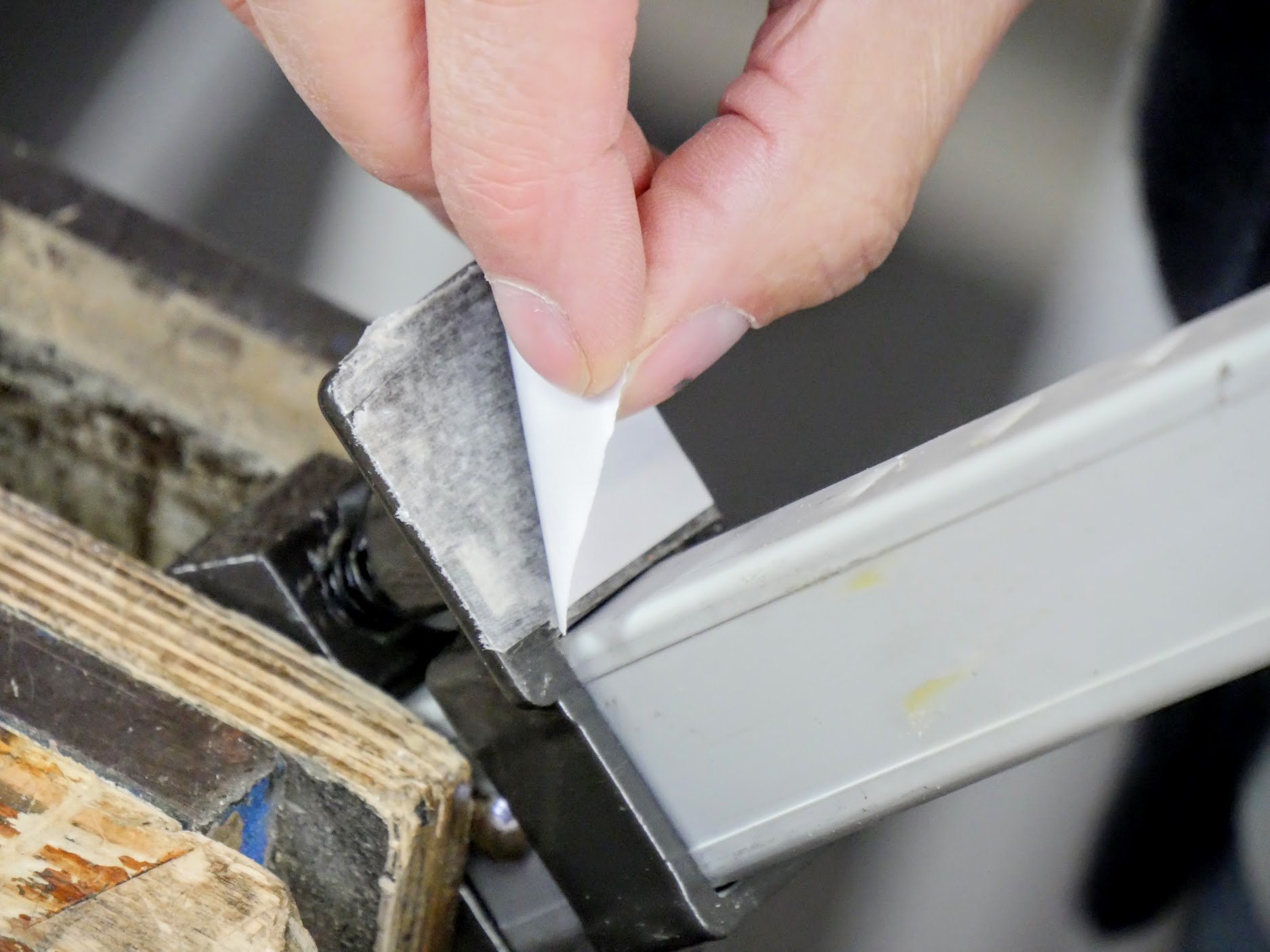 Step 6: The clamp heads come with no cushioning and can mar the wood. I use squares of 1/4" plywood as this holds up well under the pressure of the clamps. Use two-sided tape like picture mounting tape to stick the pads to the clamp heads. Roughen the paint surface with abrasive paper first to improve adhesion.