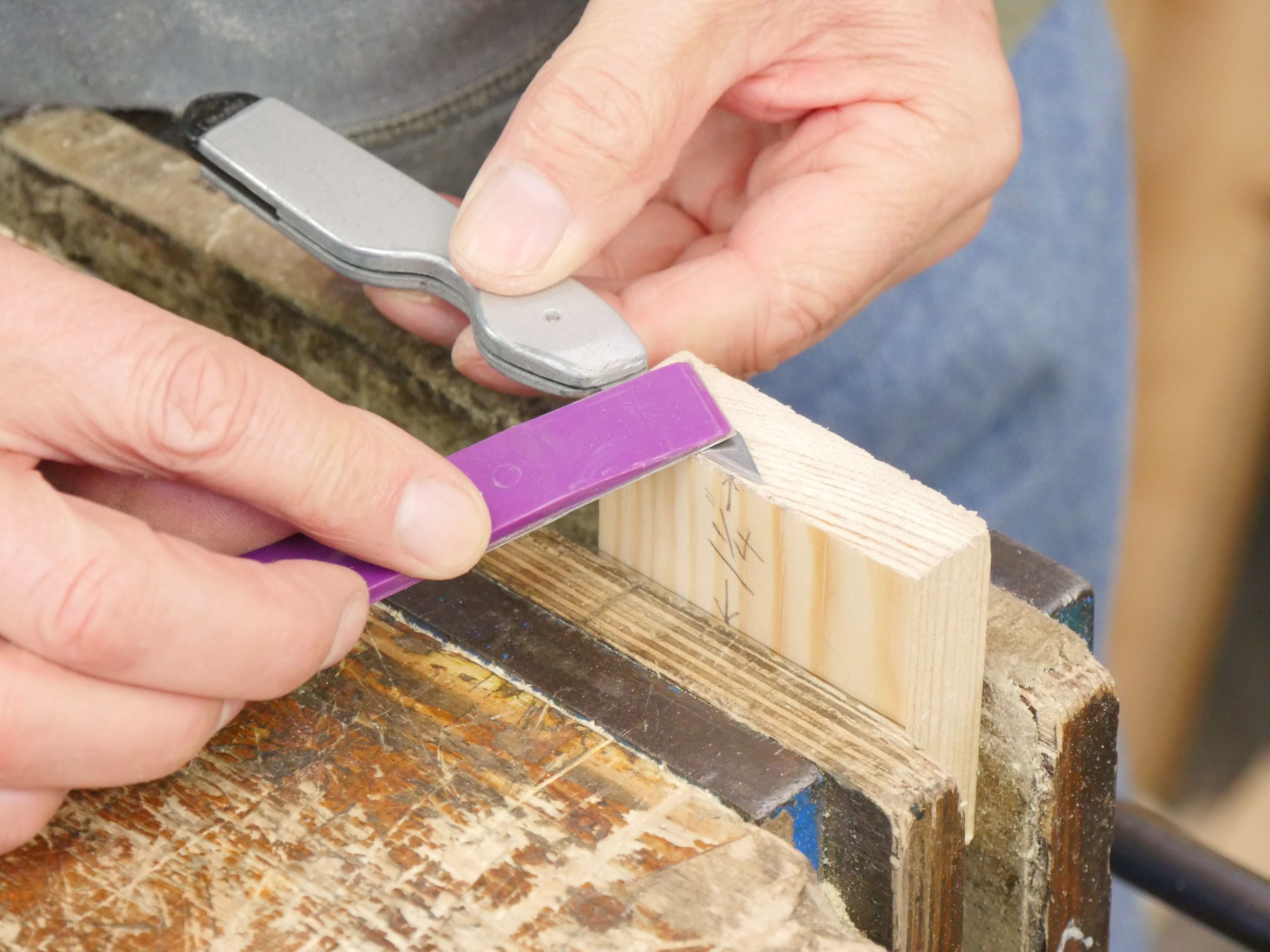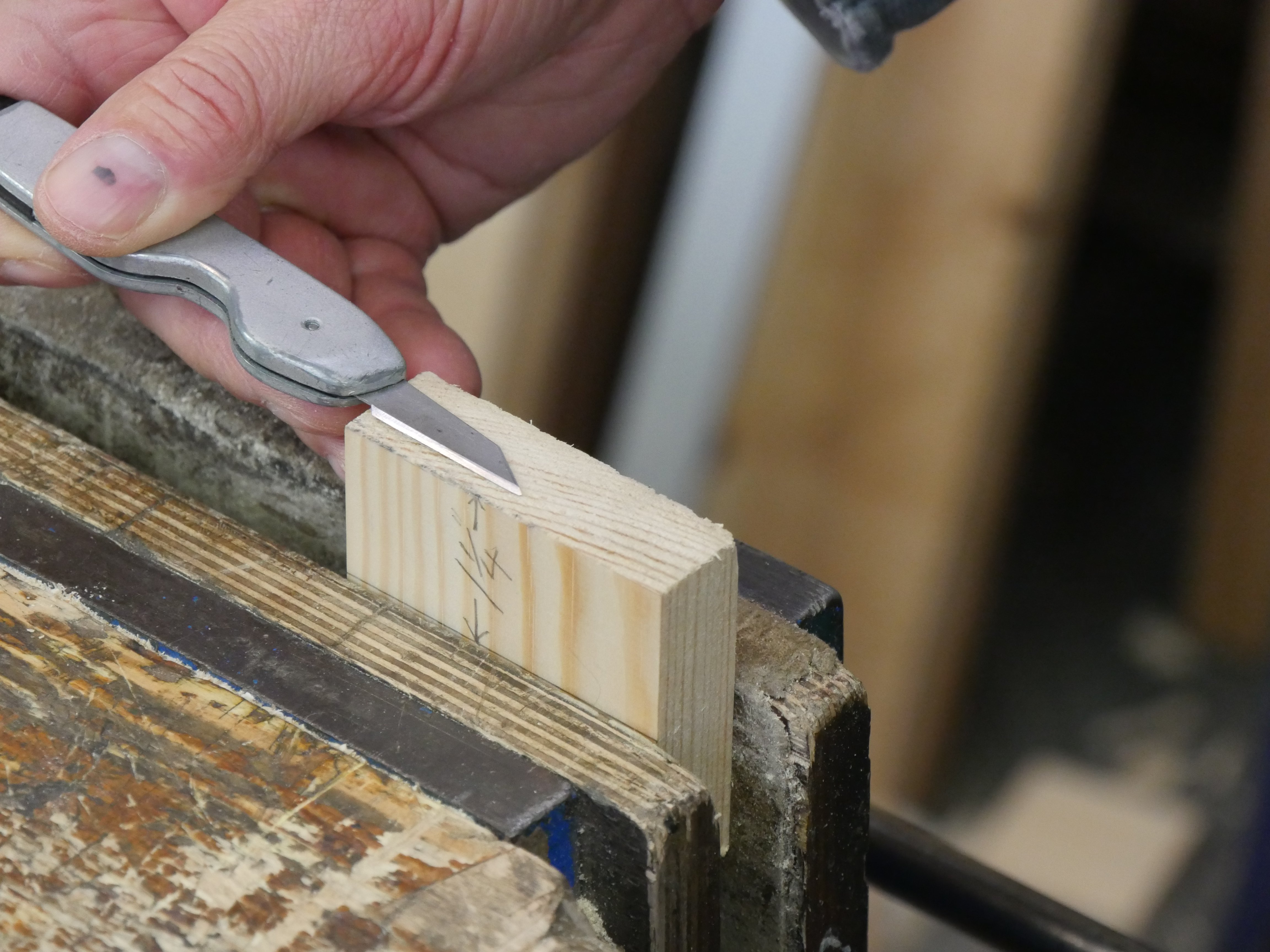 Lock the block in the vise with the line aligned with the benchtop. This ensures the bevel is evenly bevelled.