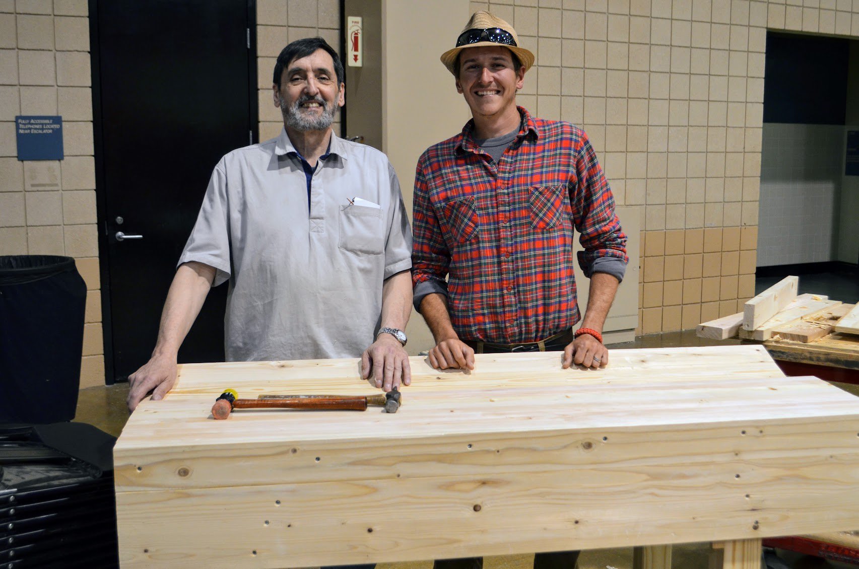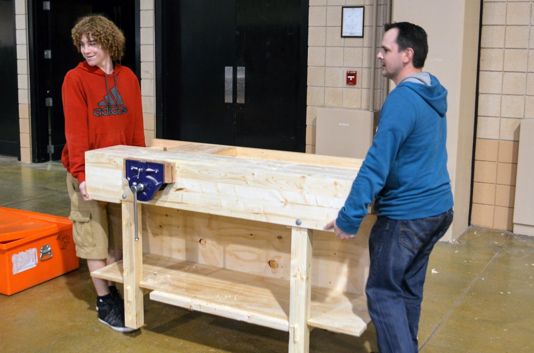 On this tour, fighting blizzards in January, low visibility and long hard days of driving, I chose to do something to prove a point. I was inspired to make a workbench as I traveled the states that I could give away at the end of the tour through a drawing from hat at the last show. When people knew this they wanted a piece of the action and volunteered their labour into the mix. The drawing was for under 25 year olds. With each state the bench grew. They and I planed and chopped, sanded and glued. At the end of the show the raffle took place and we gave the bench away to the new owner. As a consolation we gave away a second bench, the one I was travelling with. Happy owners all round!