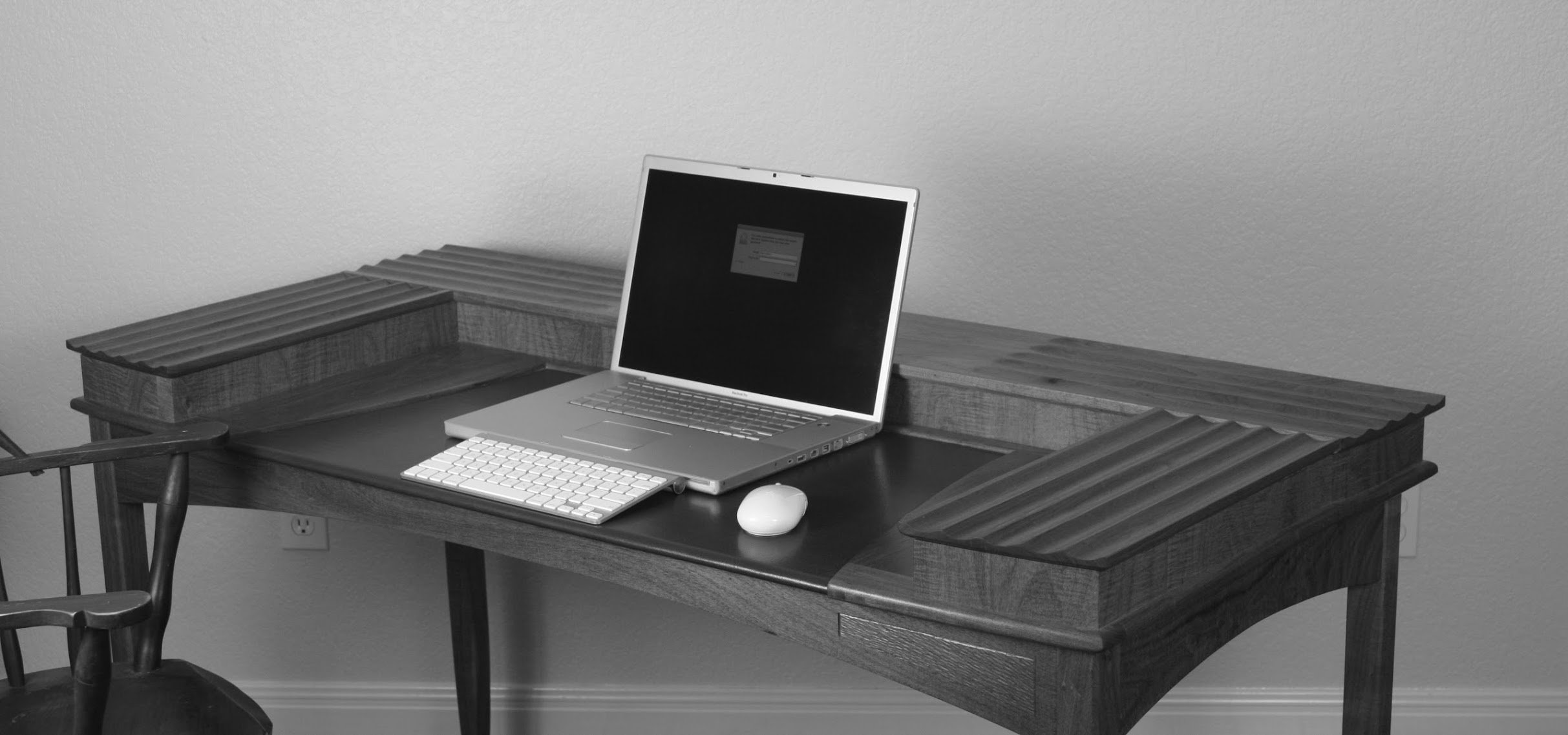 This home desk I designed and made in 2012. It takes a small and compact computer and the tabletop elevates for use as a drawing table too. The comfort for typing on a laptop at an incline works fine or it can be level. Personally I think I do prefer the ability to change angles. The tabletop lifts up all the way for stowing a laptop, mouse or finger pad and keyboard. Within its innards is an outlet for charging a device. This design is lower than a standard table height by 3”.