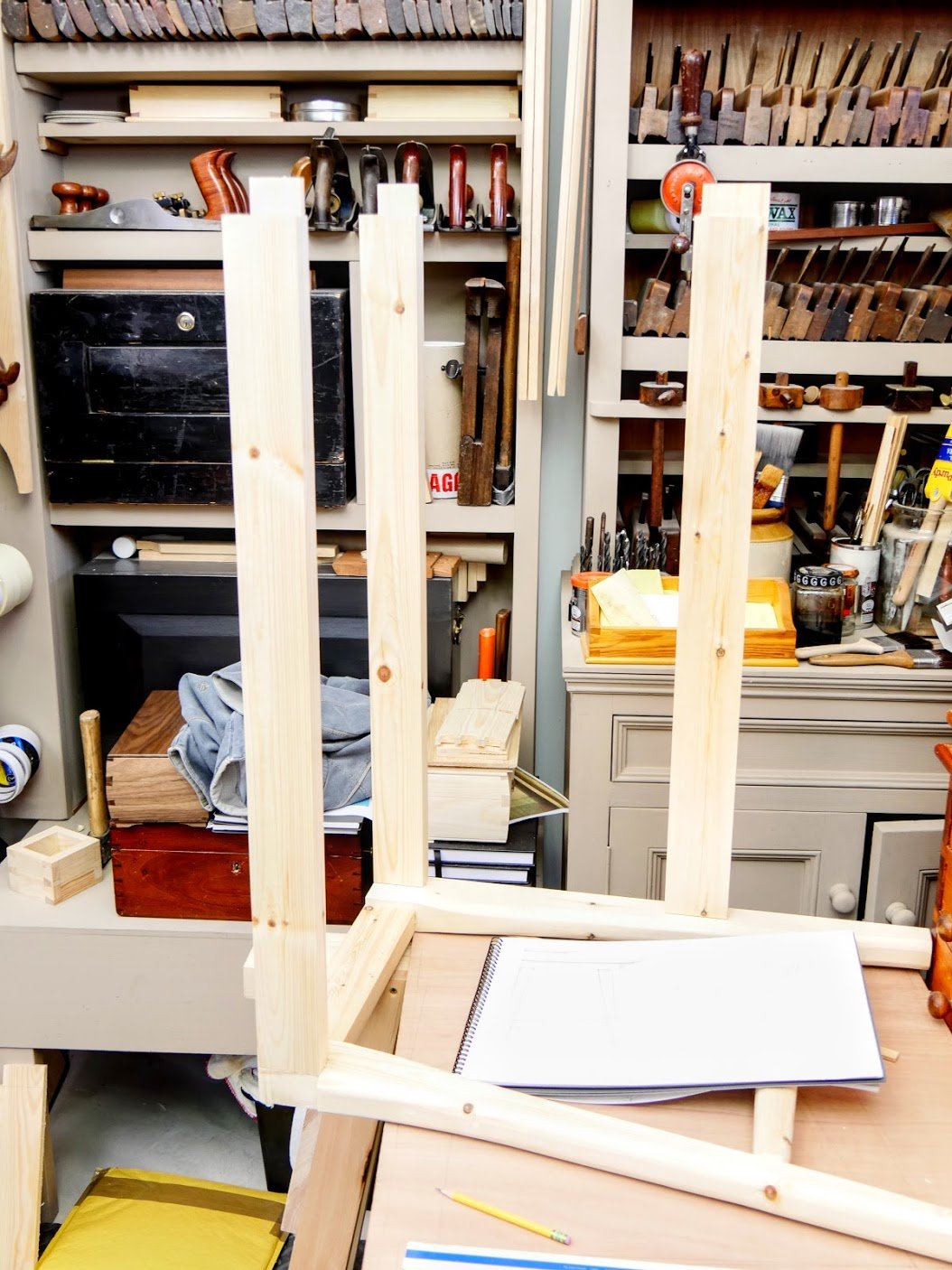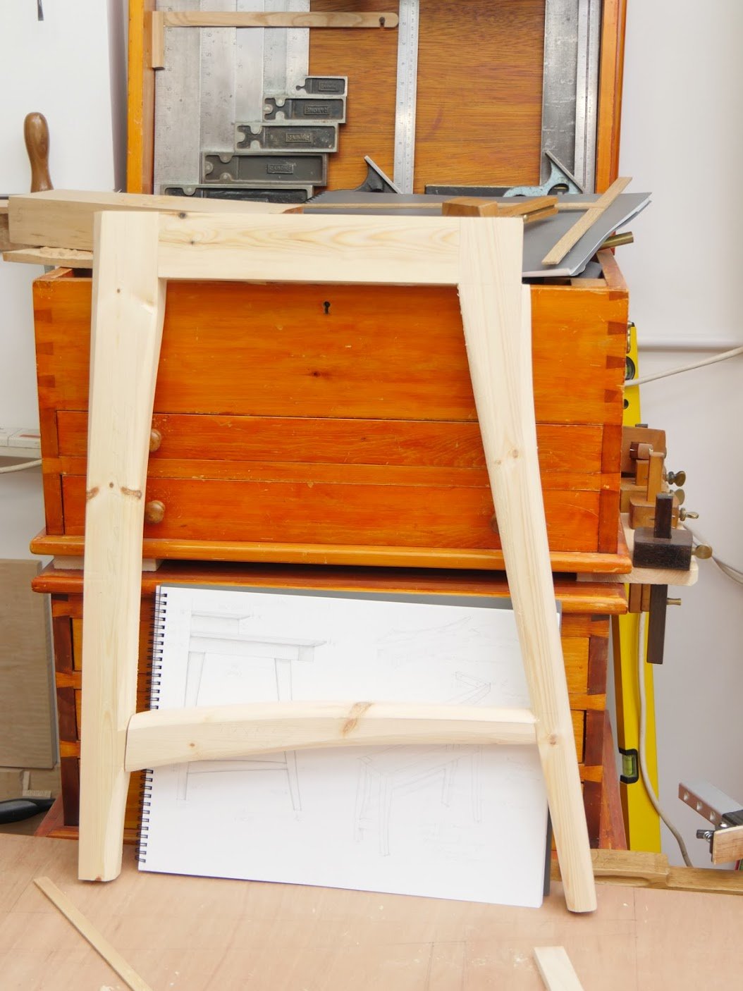 My current quest this week has been the design for a compact computer desk so once more I am prototyping in pine for speed and efficiency as well as economy. I had a blank sheet and drawing out the design came to me quite quickly, which is always nice. It's been going well so far and I have the main frame for legs, rails and aprons just about together. I have chosen oak for this project as I have some nicely figured wood but there is still time for that to change yet.