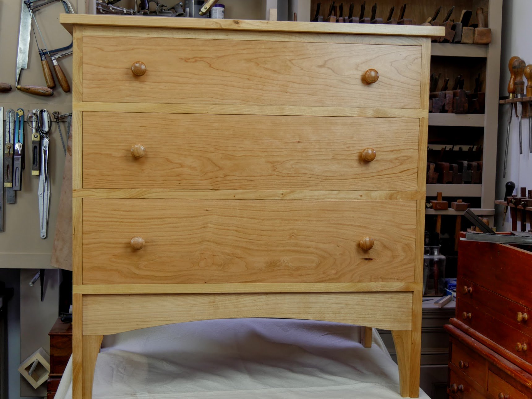 My highlight was finishing off my new box–actually, though it is a completely new design, it’s my second one in that I made the prototype first, to test out the methods I’d devised in my head. Of course they worked. There are complexities throughout this design. With both sides and end pieces rounder, as they are with a 10 ⅝” radius, I developed angled shoulder lines to give something of an illusional curve; it worked I think. What this did was took out the clumsiness to make the overall appearance lighter looking and more graceful. I sketched out my thoughts in my sketch pad to prepare myself and search out what could be problem areas before I began the actual work. This is useful for developing the final working drawings. I also made the joints independently first, I mean as a single corner and not as part of the box. This helped me to know I was on the right track. As it was in the cherry chest of drawers currently being built now wwmc, there are hidden complexities to enhance the project. In this case, we once again must allow for expansion or contraction of wood. In this case I groove the inside faces of the box top and bottom and then grooved the edges of the top and bottom pieces. The plough plane is perfect for this, quick, simple and highly effective.