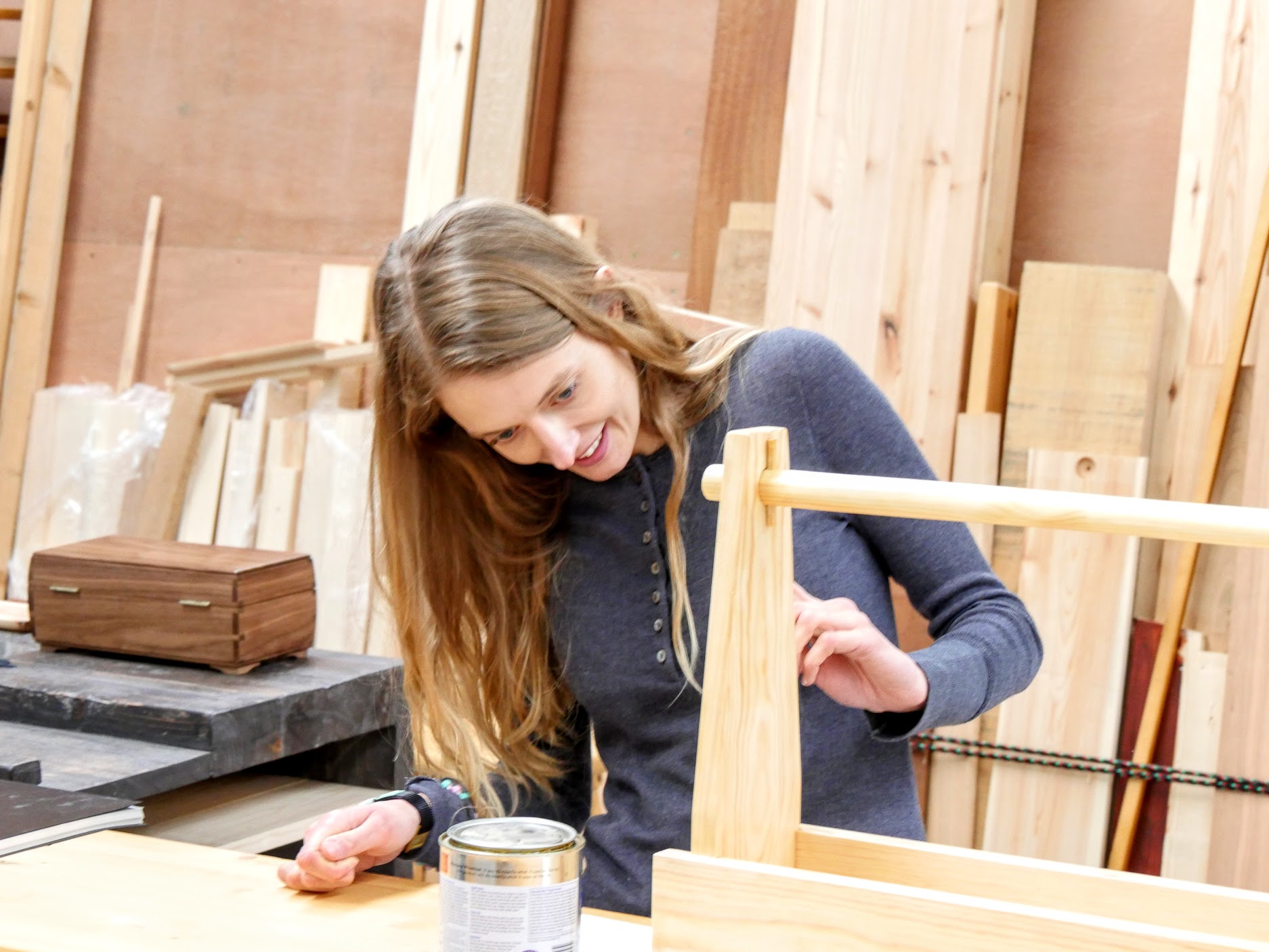 This past week, she applied the first coat of finish to her tool tote. All the joints were snug and I enjoyed seeing her face when all the components finally came together. She rounded the handle by hand planing and split the small dowels by splitting and rounding with a chisel. The rounding was perfected by driving the rough-cut splits through a ¼” hole in steel; the poor man’s dowel maker - see it here.