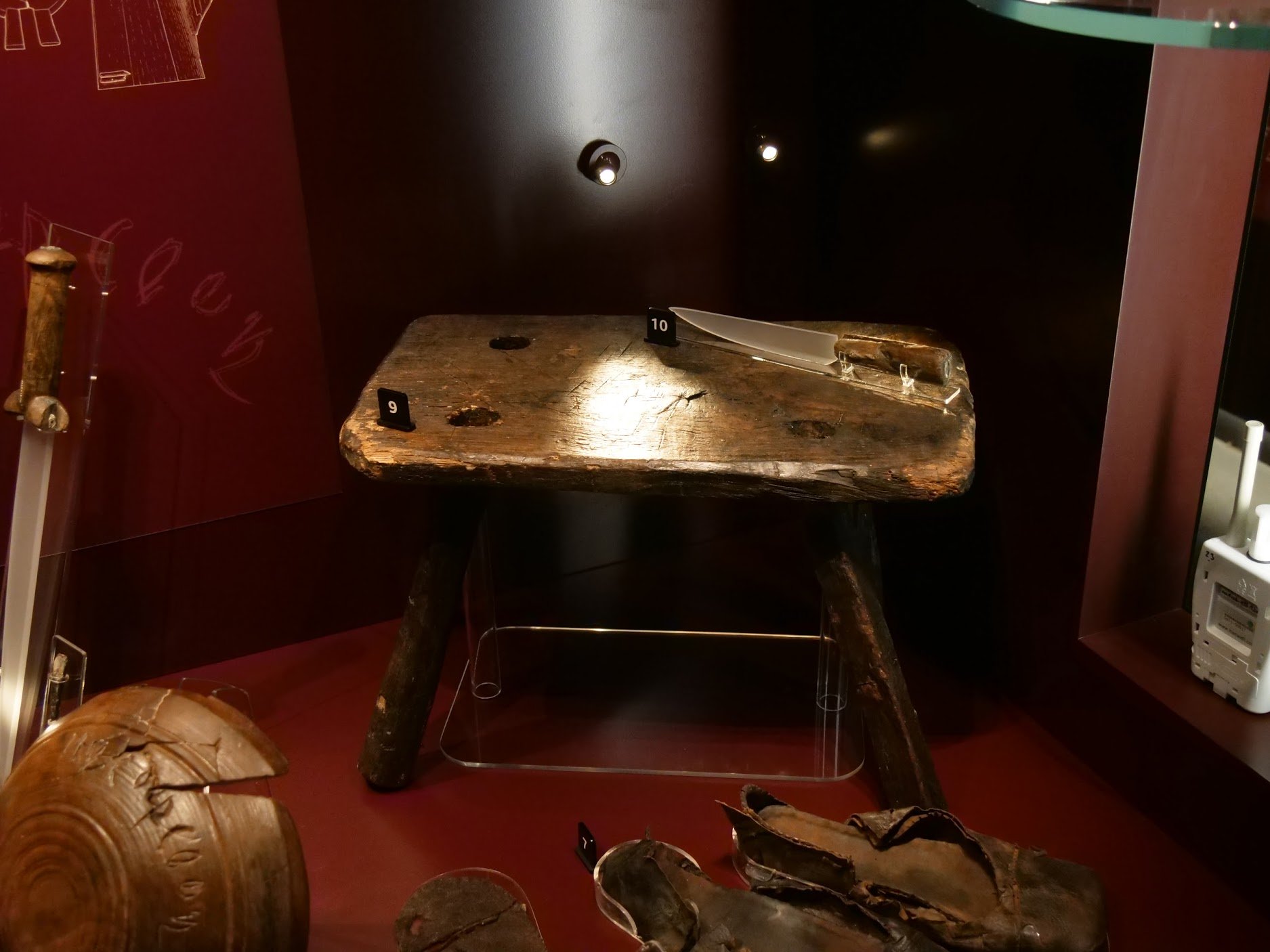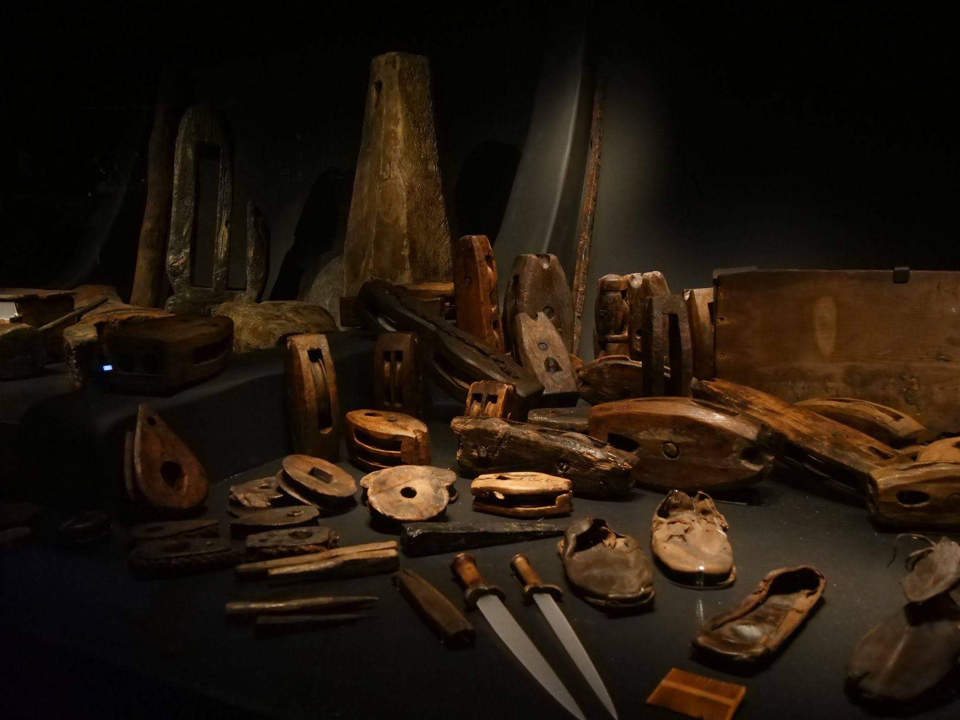 It would be too much to blog on the shipwright’s work when the ship is so large. Boats would be much easier. It wasn’t in any way nostalgia that called me to visit Portsmouth nor anything to do with a nautical life on the open sea. It was wood and its working that drew me, you know, the centuries where wood became a world for seafarers suspended lives in. Something happens to you when realisation catches you unawares. It's not shock, and surprise doesn't quite measure up somehow. There is a sense of overwhelming privilege at you suddenly being privy to fully comprehending whole meaning about the significance of something. I have seen multiple thousands of hand tools through my life as a crafting artisan using them and then collecting and researching them too. Often I can stab a good guess about their age, functionality, trade and so on. Most of the time I know exactly everything about them, but seeing tools and equipment you absolutely know are 500 years old somehow becomes all consuming. When tools and equipment and a way of life are encapsulated in a life holding time capsule you are absolutely stumped, stopped and humbled. This time capsule, the Mary Rose, is nothing less than an archeological dig. I know that, but somehow a dig is attached to a globe full of coexisting entities. The ship, the isolation of life within a wooden hull, for the main part fully in tact, seemed somehow to be a preservation of actual fact but in a very different way and for a different reason. The reason records life as it was when it stopped. All seemed to remain essentially the same, and it's that that somehow seems to me the most humbling. No machines as we might know them existed here. Braces formed from wood into which a bit with a spur fit fell by the bench where it was used, alongside a dog tormented by the tumult and drowning in a watery grave. I’m talking about awls twisted hot by a blacksmith below deck for a shell-type augur I might in my current life just take for granted.