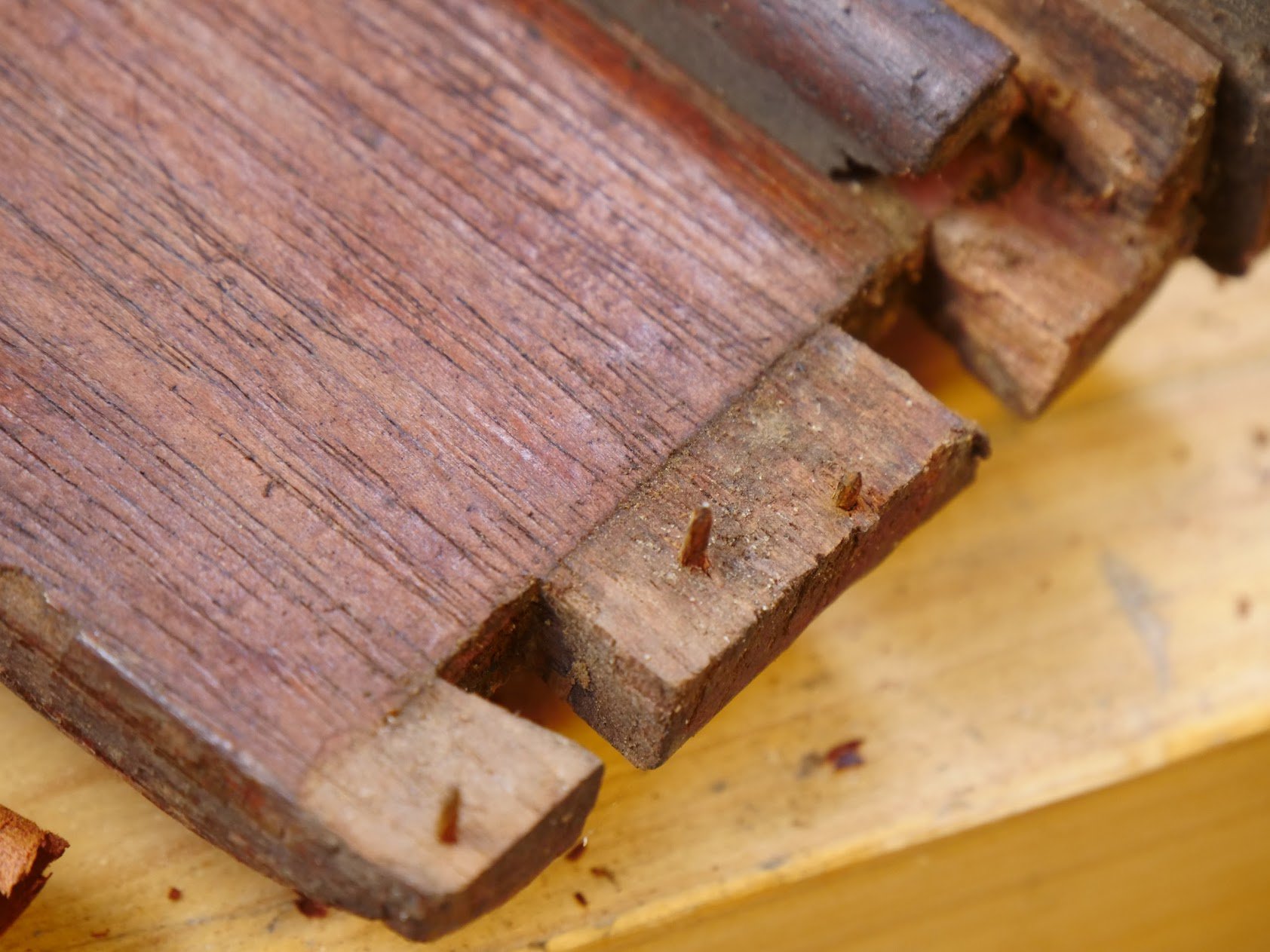 In a YouTube video I showed how to use a finish nail as a drill identically sized to the nail you would nail with. Someone said which furniture maker would use nails. He was full of pride. Look back in history and there would be no one working with wood didn’t have need of a well-placed, well-driven nail. I let the comment slide. Nails were a great invention. They just shouldn’t be used in the place of joints as is common today. So in and throughout these pieces there are indeed nails. Some nails worked in place of clamps. This is what the arrogant pup wouldn’t know. Screws too have long since been used as temporary clamps until the glue sets. It’s just that the nails and screws weren't always removed because it was often cheaper to leave them there than to take them out. There was a time when nails were very expensive, screws too. So you see, nails were commonly used in many areas of woodworking craftwork. Usually only where necessary. A lip round a table rim would be glued and pinned, heads punched and then wax filled, bees wax, before staining and polishing.