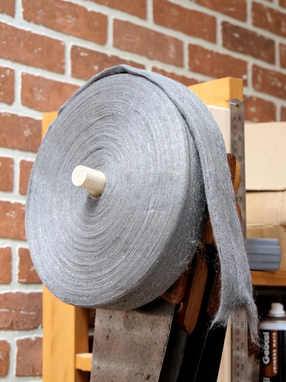 Steel wool comes in grades of coarseness and we generally avoid coarse except for stripping back a finish with a solvent. Usually shellac needs no such treatment as shellac is readily dissolved by the repairing layers of shellac coats you apply. The fine level steel wool we use for repairing and not stripping is classified by a series of four 0000’s marked on the packet. This is the finest level we might need. We also look for long strands rather than pads. In this case the steel wool is rolled as you can see. The long strands enable us to pull off six inches or so that we then fold. The wool lasts longer and is less prone to crumblling this way. Liberon is my provider of choice. It has only the lightest amount of oil, just enough to inhibit rust and it doesn’t affect the finishes I apply.