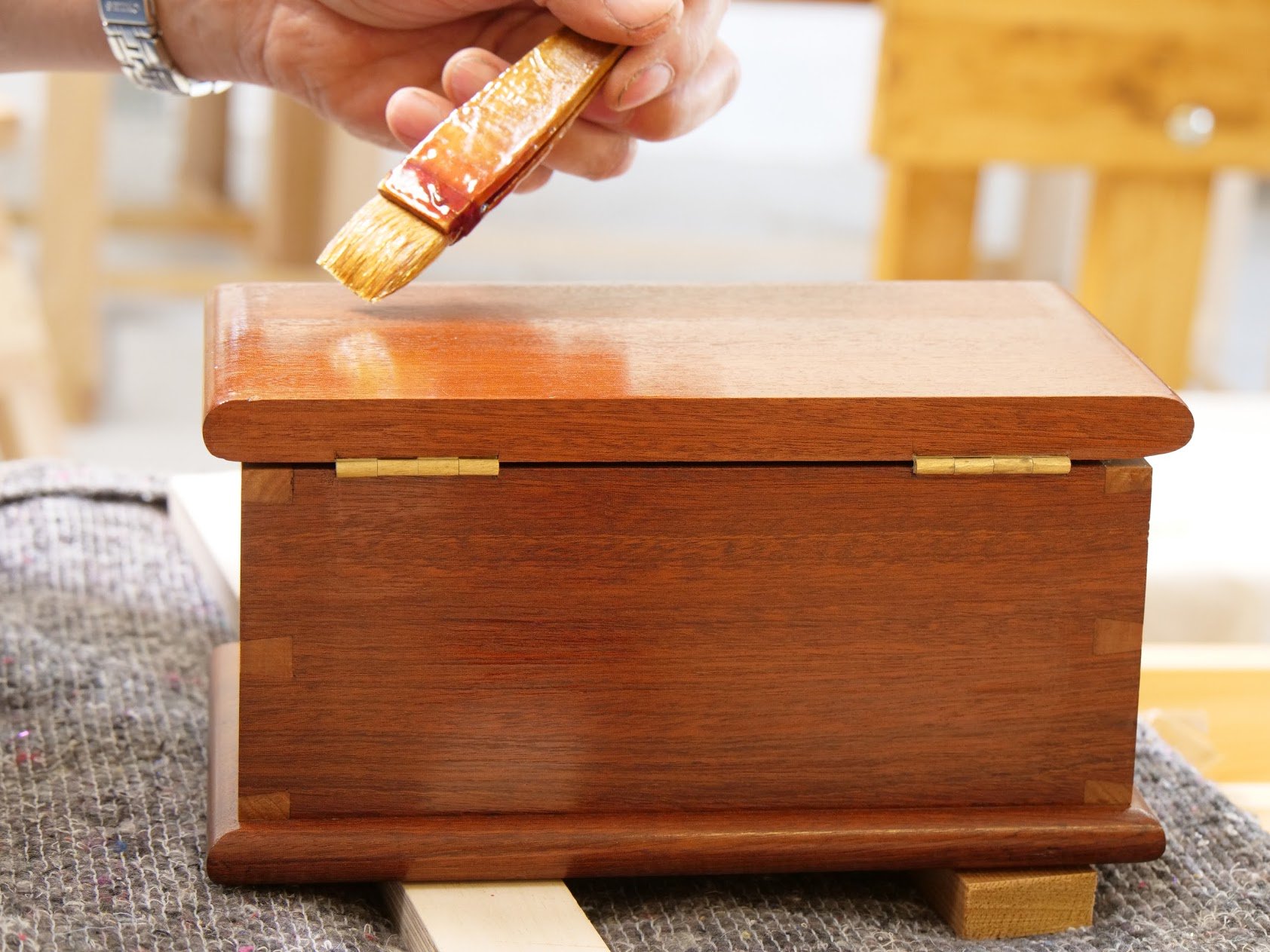 My famous box got bashed about through the years of display and handling. Actually, apart from being dropped on concrete twice, it’s stood up very well, such is shellac. The coats have not worn through anywhere despite being well handled by visitors, but regardless, repairing and restoring shellac is very quick and easy.