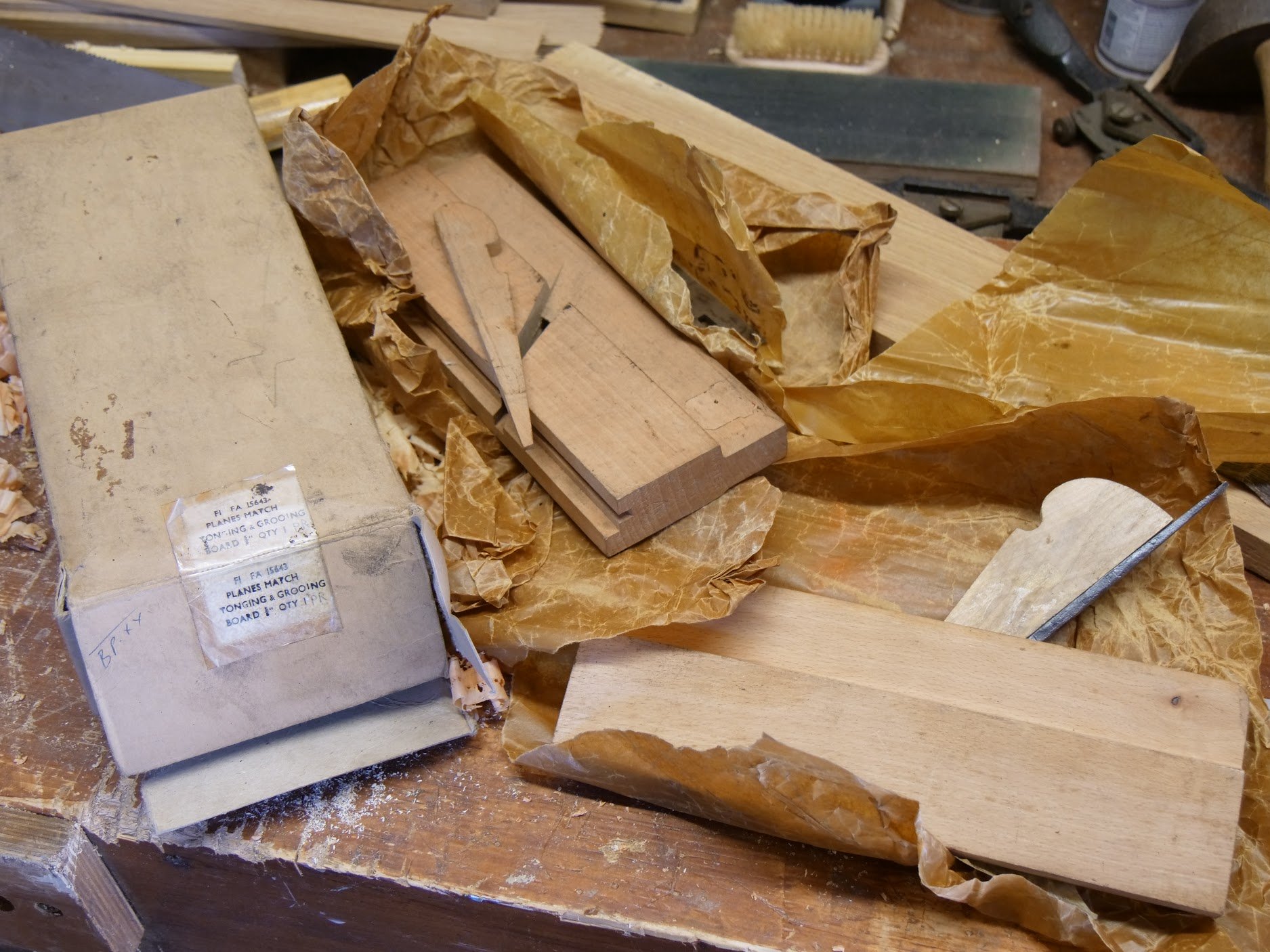 And what about a pair of wooden T&G planes, boxed, named and still wrapped in their wax paper. Unused too, these planes are beechwood one were “war issue” , which means they were sent out without any kind of finish being applied by the manufacturer. T&G stands for tongue and groove. They were created to make tongue and groove boarding. These plane types are surprisingly useful and I use them a lot for creating paneling, inlay work, even sections of say floor boarding for the bottoms of a chest or a drawer bottom. Such like that they are instant. No fence setting, no depth setting–both one built into the planes. These planes come in various sizes depending mostly on the thickness of boards. Usually they go up to ⅞’’ and start at 3/16”. That means the thickness of wood for the latter is actually 3/16” with a 1/16” tongue and groove. This is very rare but I have such a pair. Common sizes are suited to material thickness from ⅜”, ½”, ⅝”, ¾” and ⅞”, by thatI mean the stock to be worked nit the stock of the planes. I have known other sizes but these are common. I also bought a used pair for £20 because I saw them and use them fairly regularly. They worked on arrival but were not a matched pair made by the same maker but two different makers. That said, they did match.