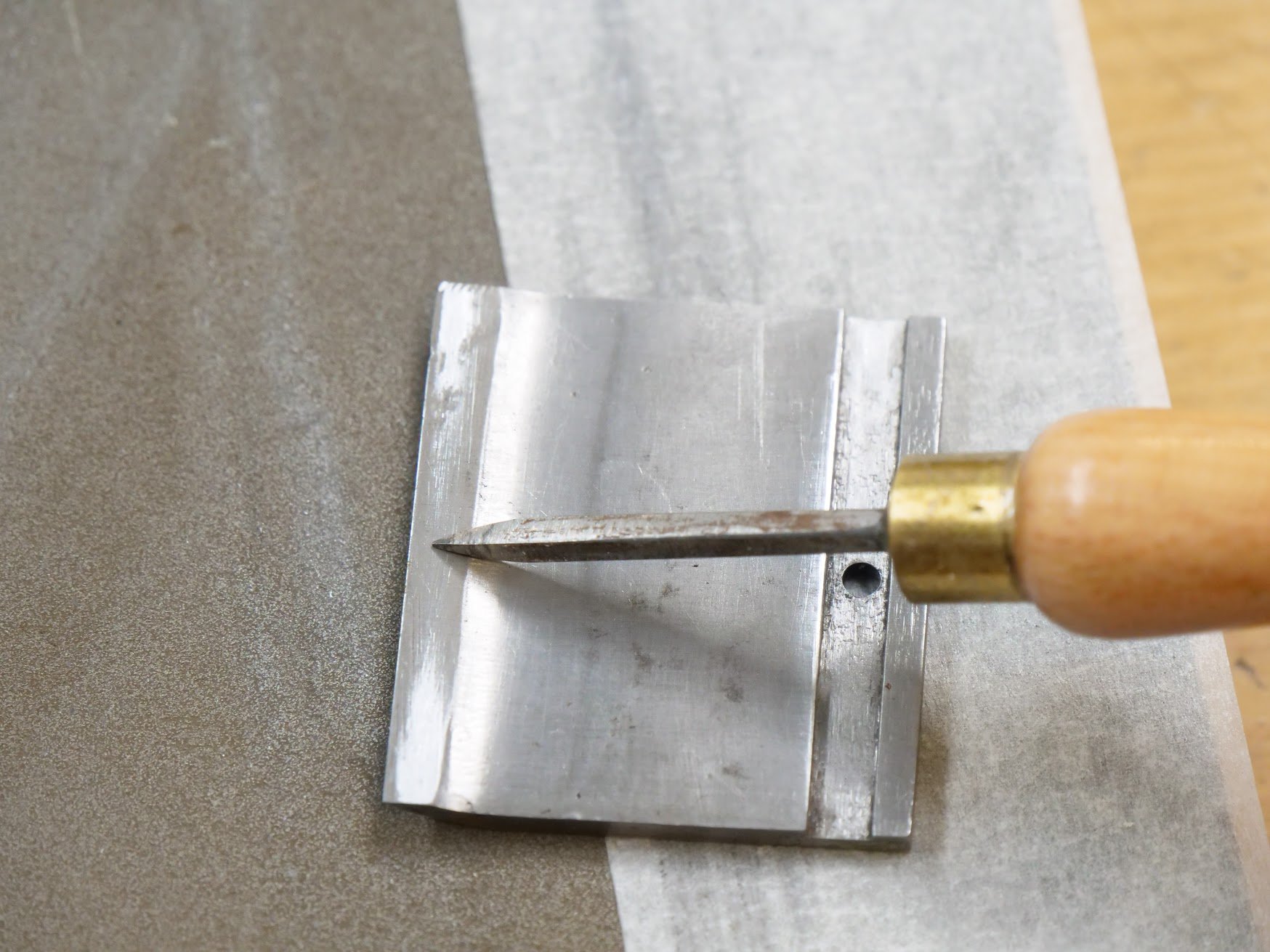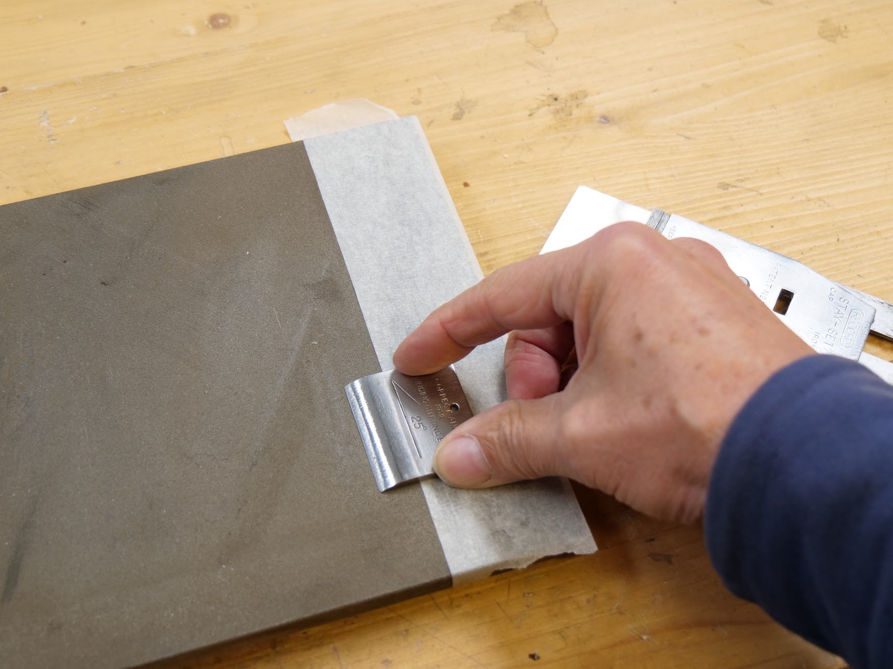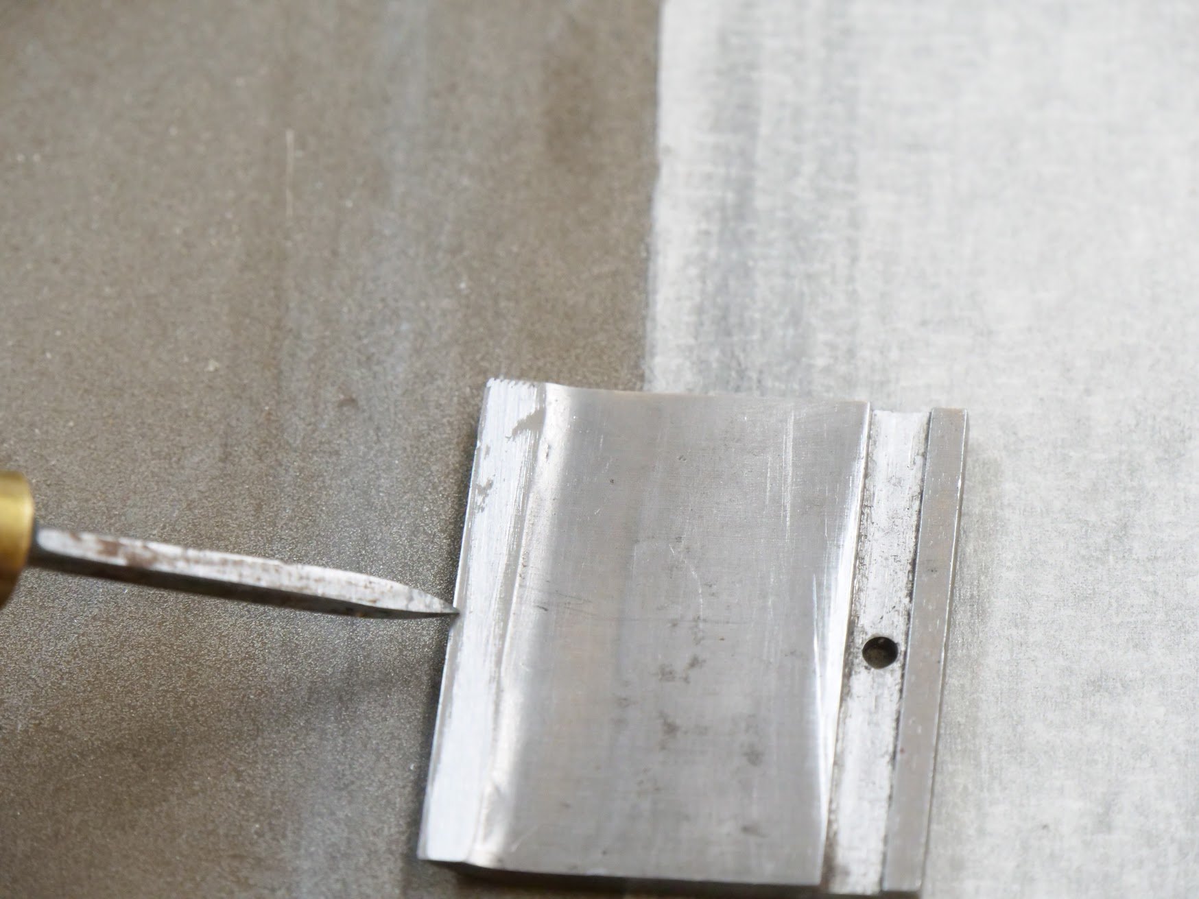 No matter the cap iron type, it's a simple thing to flatten the underside of the cap iron on a flat surface. Here I am using a diamond plate but a file or abrasive paper will do the same. Rub back and forth if using stones or plates or abrasive paper on a flat surface. Flip over to look for shine and this will reveal any hollow or bevel to the underside.