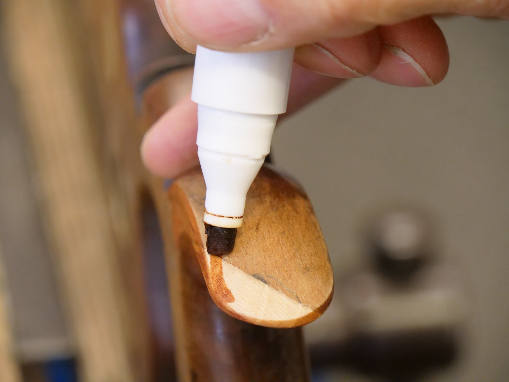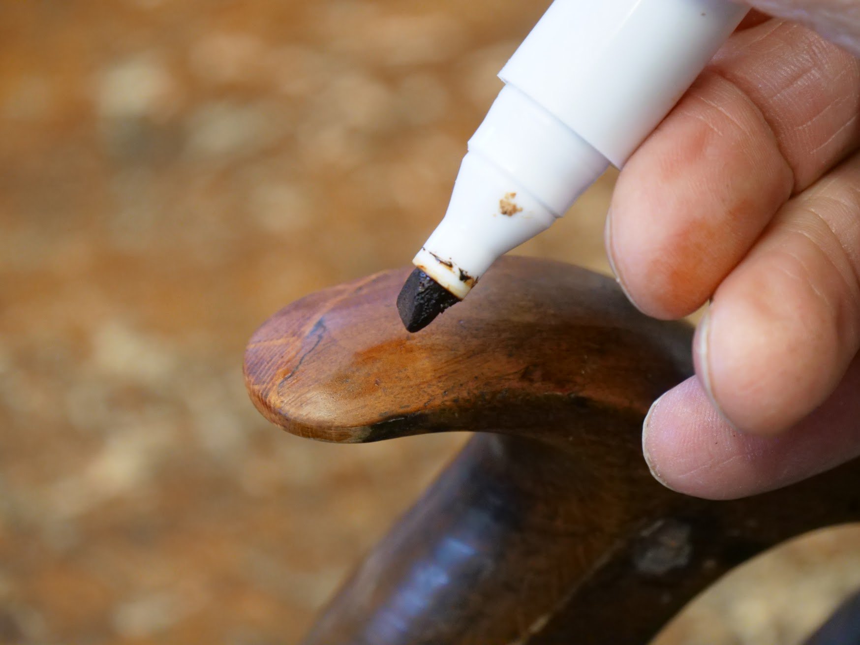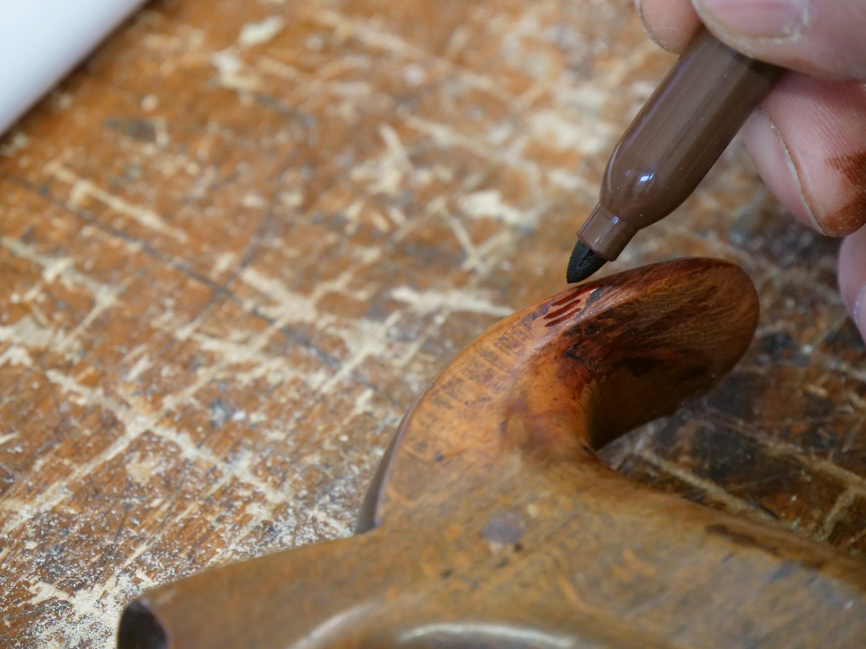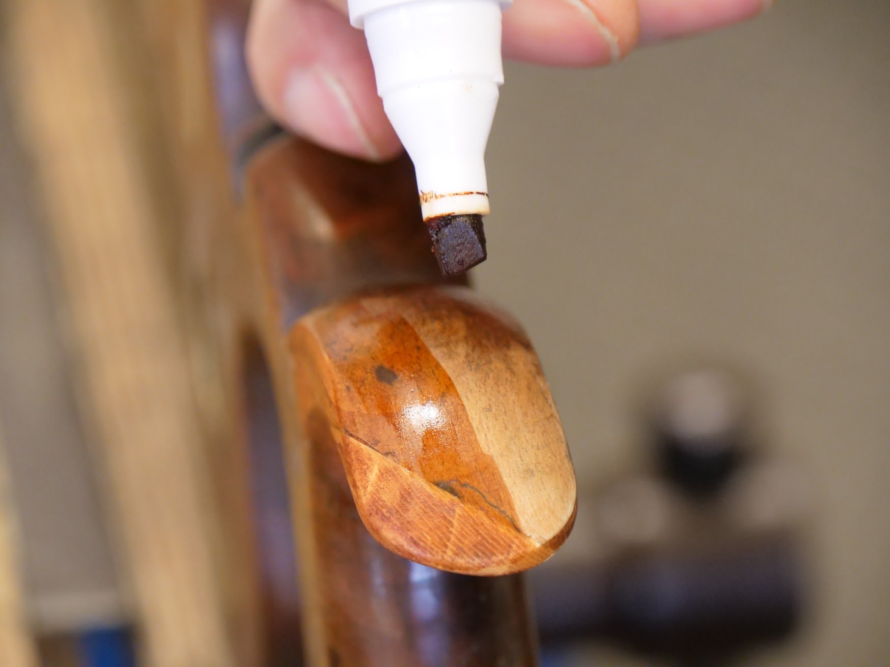 I used furniture touch-up felt tips to add the colour I needed. Two colours did the trick mostly but I needed to dd a little darkness and used brown Sharpie pen for the final depth of colour.