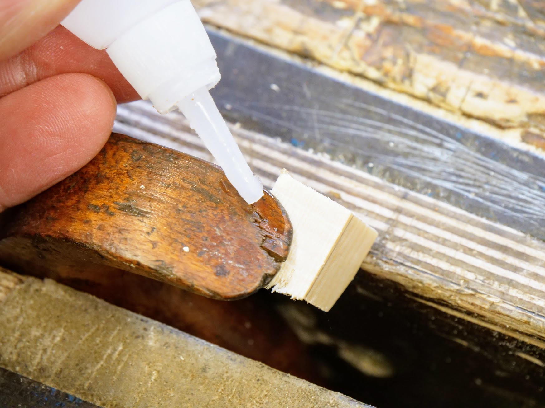 If you read a previous post on this issue it will help you. This saw had been dropped also onto the horns of the handle and the had slight cracks (a common issue) but both points were still fully anchored in place. I used thin superglue first, to wick into the roots of the cracks, and then I used a thicker version for the larger openness. A wedge placed appropriately pushed it fully into place and a light misting of accelerator gave me total closure. Chisel, file and knife work followed by light sanding and colouring with a brown and black Sharpie mix did the final trick of colour matching.