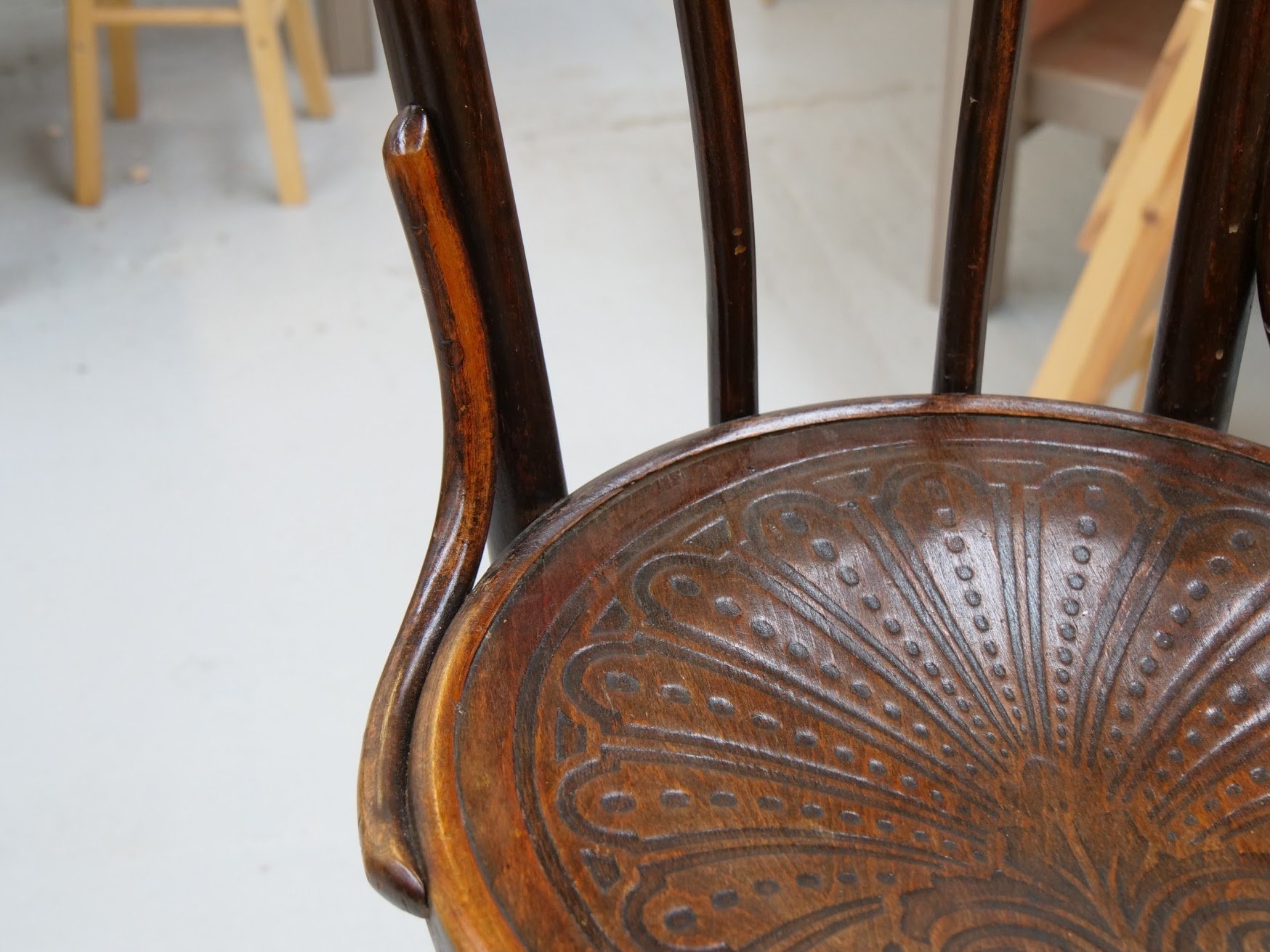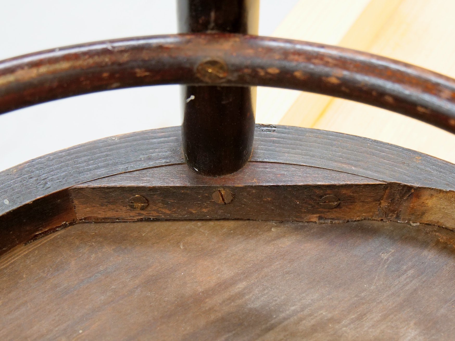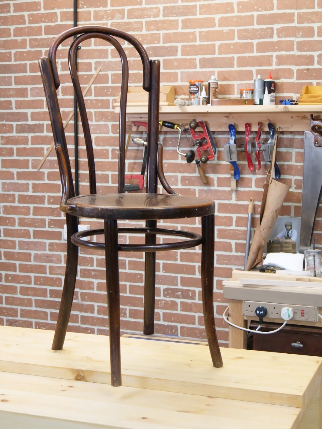 I bought this Thonet-style chair from a charity shop and paid £25 for it. It's a 1950s version but it follows several elements of Thonet. The seat rim is widened to receive the leg tenons of the front legs as was the original Thonet. Three screws secured the added pieces to the rim with one of the screws passing into the top of the front legs. The lower hoop adds to the stability of the chair and was a simple addition effectively creating the bracing one might get from a wide rail apron in traditionally jointed chairs. Adding corner bracing strengthens the chair phenomenally. This is because when you bend straight wood it retains the intrinsic strength value afforded by any continuous grain.