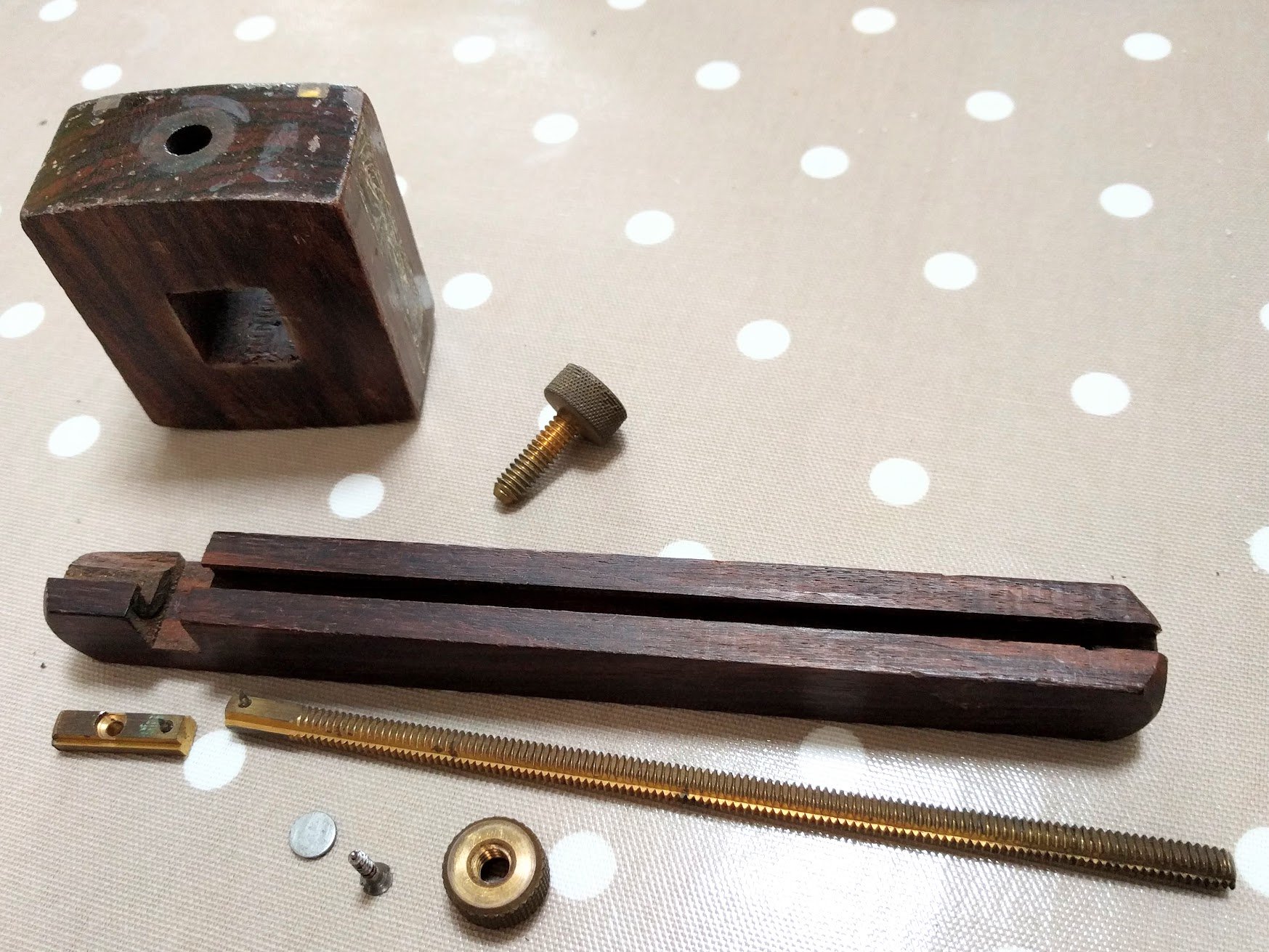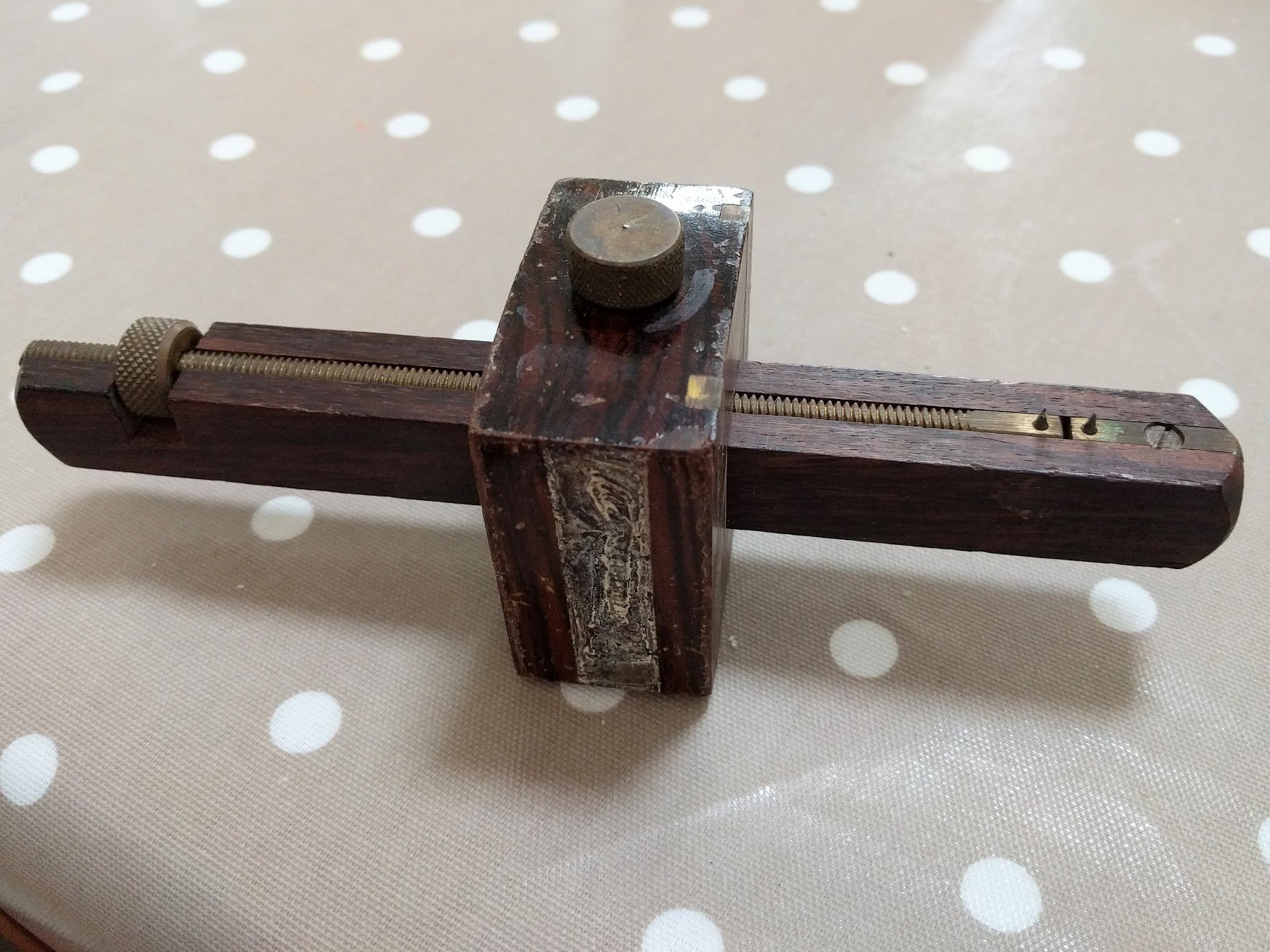 The threaded brass rod has been milled with two rebates that retain the rod in the wooden stem by a groove. It's compact and neat, neatly done and effective. It would be easy to replicate with rod of all thread in brass and a brass nut with grooves filed into it. So here I am with yet another mortise gauge I may well keep as it is rather than convert it to a combination gauge. It does need a little restorative work to make it feel good in my hand. 15 minutes work I should think. Yes, I'll use it, but alongside my others. I have always liked gauges made by Mawhood, and Rosewood always look lovely no matter the tool.