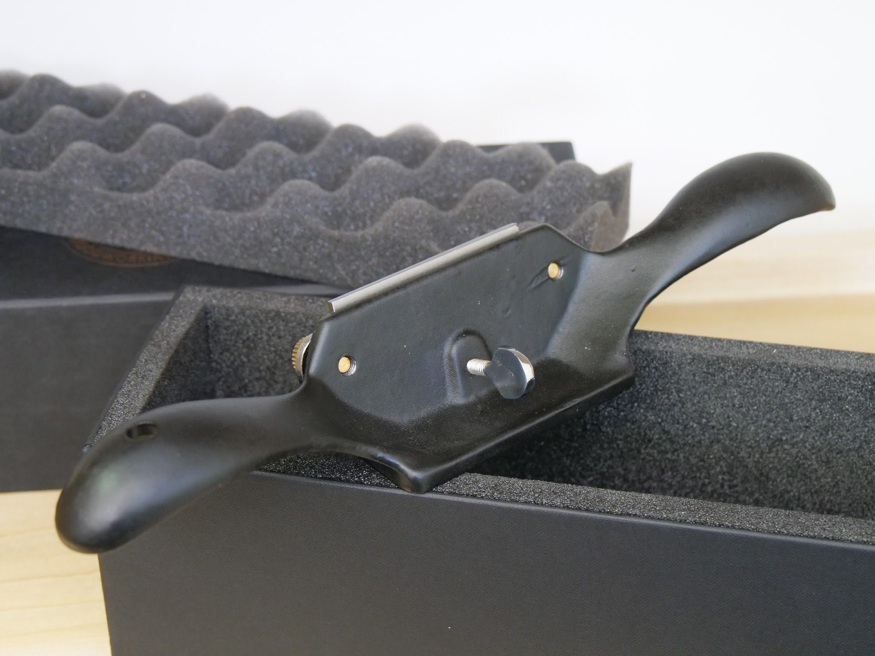 Apart from the misnomer as a plane, when I looked at the Rider pictures it wasn't so much the overall appearance of the box, the name or the tool itself that grabbed my attention but seeing what looked like a thicker cutting iron. I had never seen a thick iron on a scraper anywhere so I wanted to see how well a thicker iron performed over the standard thinner one. Would the thick iron be difficult to flex-bend to task as this is what the tool depends on for creating and adjusting depth of cut. As I pulled the scraper from the box my first impression was that it was a tool of quality. I had read two reviews on the Axminster site referencing the tool, one fairly good and the other fairly bad. Neither of them mentioned the real issues that intrigued me so.