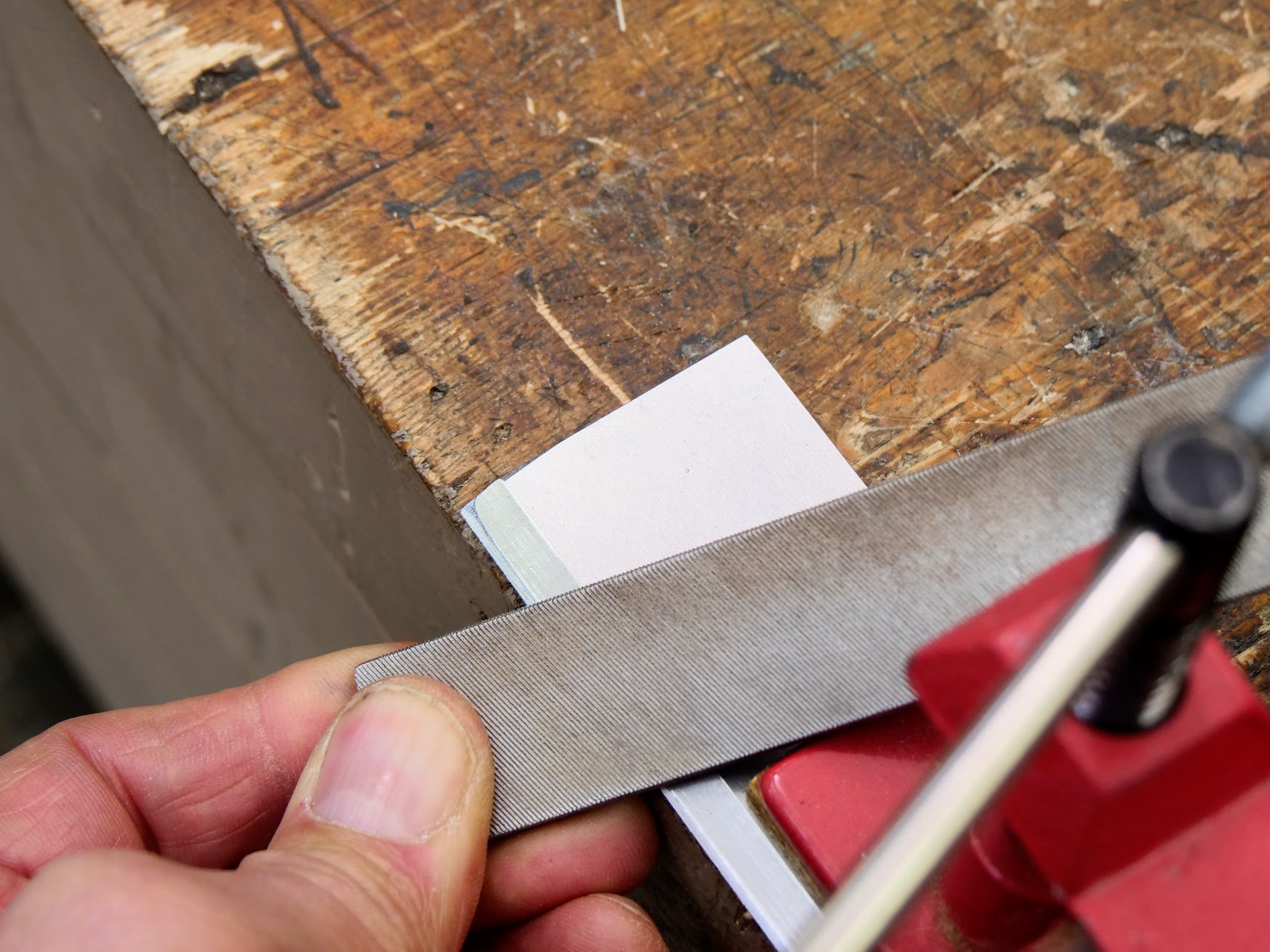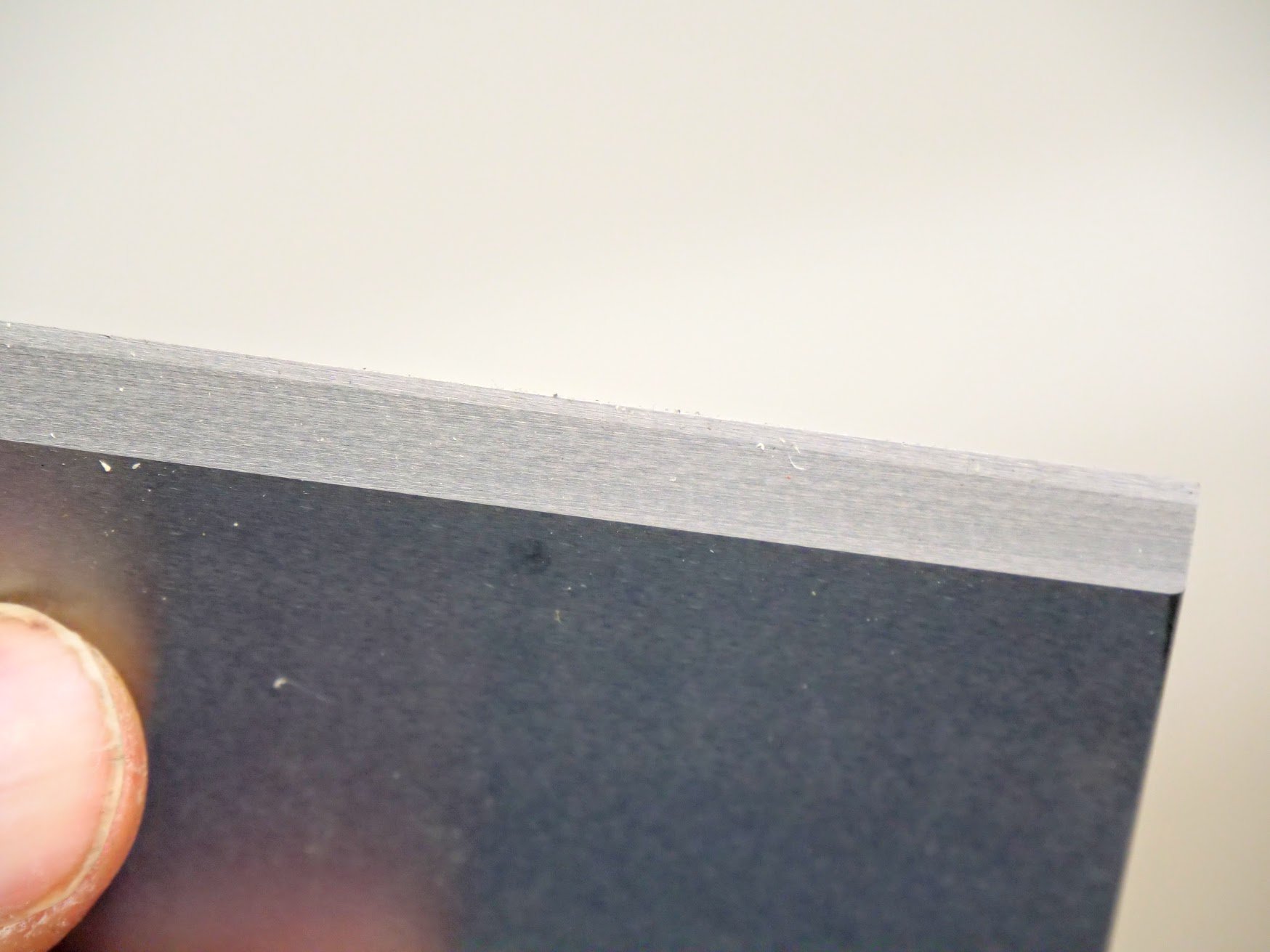 Then I asked myself why was the blade made up of two alloy types with one being laminated to the other. there was no mention of this anywhere on their site or in the booklet that came with the tool. Why was the main body of steel hardened so hard a Bahco file just glided off it but the laminated cutting edge so much softer. It had to be some kind of mistake!!! You see if the cutting edge steel of the blade is softer than the main body steel then filing the bevel becomes an impossible task but the #80 scraper relies on draw filing with a flat file for establishing the bevel and then sharpening and restoring its cutting edge ready for turning. In other words, the bevel of the main body steel prevents the file from removing the existing developed cutting burr and the ability of developing any new bevel that creates the turned cutting edges. Simply put, it is a very flawed concept. 1. The laminated two-steel type blade has steel that's too hard to sharpen with a file and because one is harder than the other the bevel cannot be sharpened with just a file makig it expensive to sharpen using diamond plates.