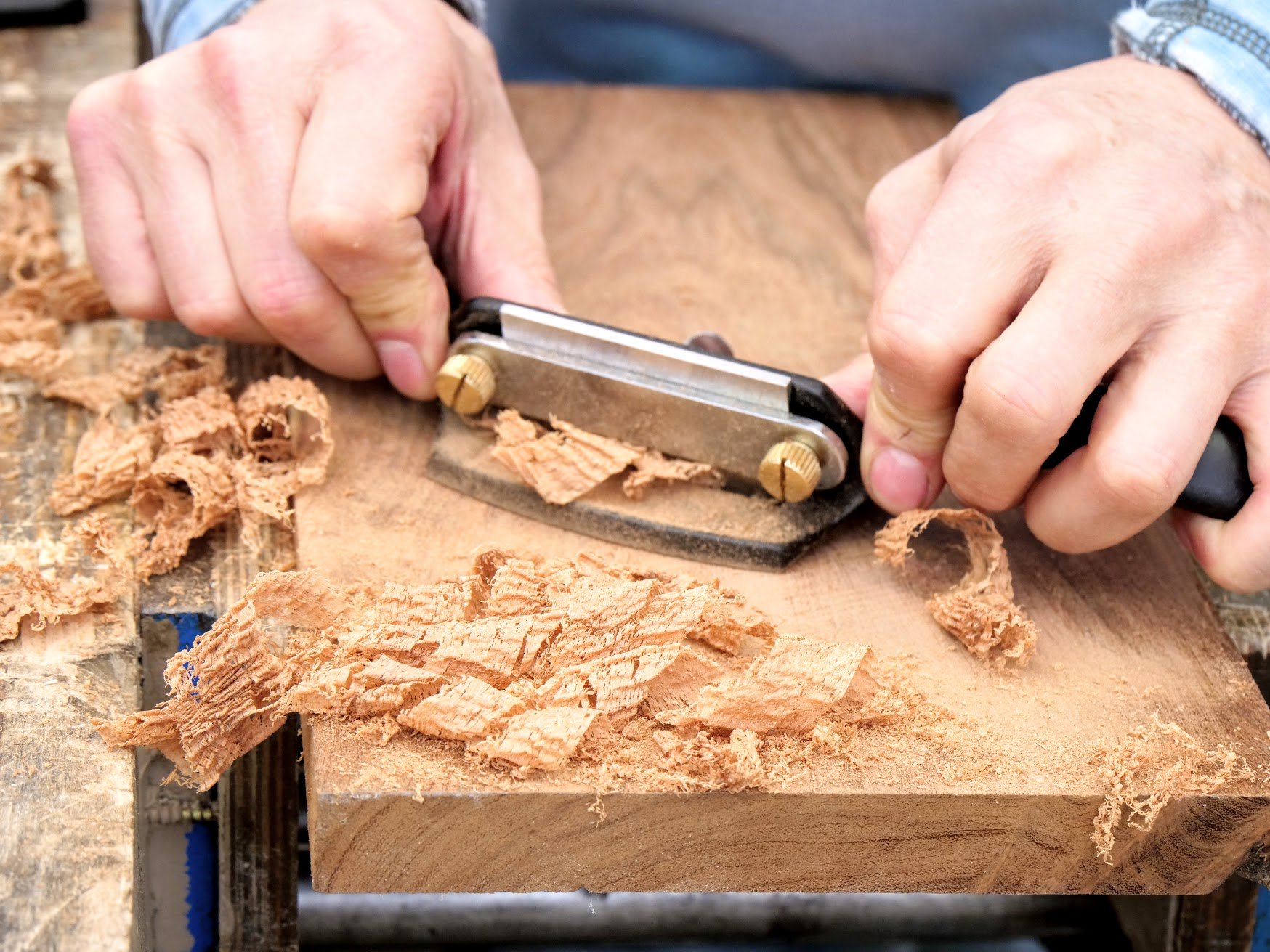 The image below shows my working with the tool on mesquite but I tested it on beech, poplar, oak and it scraped well. Mesquite is a hardwood and a hard, dense-grained wood that's almost twice as hard as oak. Poplar on the other hand can be difficult to scrape.