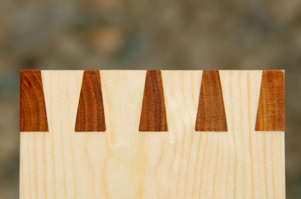 Following the numerical maxim suggested above simplifies the thought process for subsequent steps. Of course it is not a hard and fast rule, and indeed we have made boxes with twin dovetails in material less than 2", but this has been to create an exercise in accuracy for training. So the remaining factor for the single-dovetail-two-pin scenario is what size pins and what size dovetail/s? Is it equal thirds? Half pins always? Well generally those of us raised with the advent of the router bit usually shy away from equally sizing our pins and tails because in the early days of the router method the pins and tails were always the same size as each other and half pins come mostly as a result of a specific type of layout methodology. Often this was generally the first of the telltale signs in detecting just how a set of dovetails were cut. Of course in those days only real wood was used and not plywood or other engineered boards. Today the industry has shifted and I frequently see dovetailed MDF and pressed fibreboard.