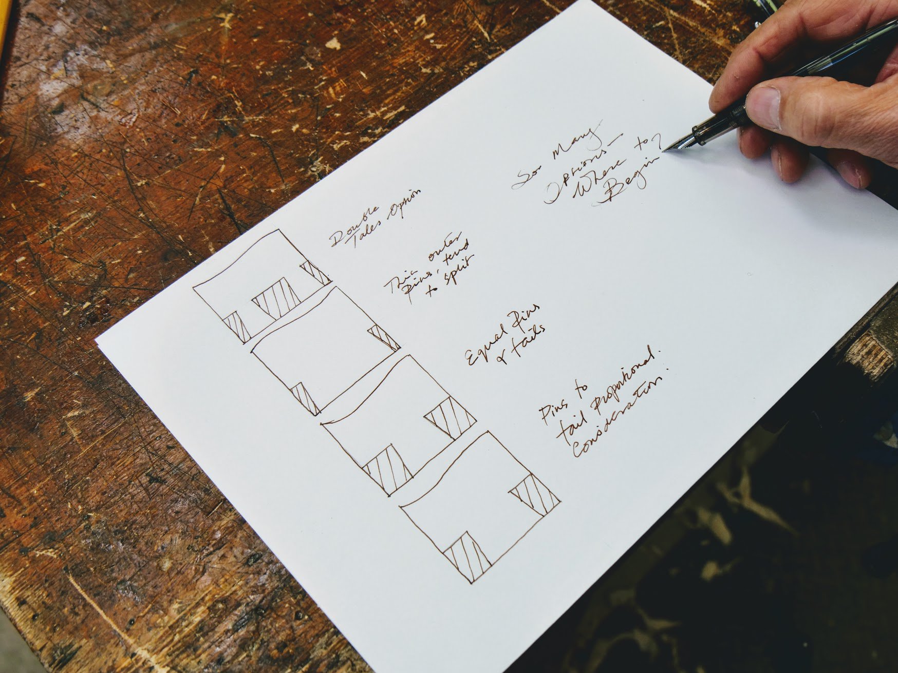 To begin my dovetails I rely often on sketching something directly onto the wood. Just to see how I feel about it. But then too, often, a sketch drafted out on the wood leads to the section of wood traced out on paper or card. Solidity in lines leads me on into the organic spheres I flex to always embrace in all I reach for. It's an aesthetic you see, and you you don't need a MA in physics to get there. You never did! Once you set certain parameters, retain a flexible versatility, you open doors in dovetailing you never dreamed possible. That's what I love about my work. Without diktats I am free to deliberate and choose. But though the end appearance requires a degree of high self-demand, I am still responsible for discovering my options, choosing sizes and proportioning tails and pins according to drawer sizes and so on as discussed. There is no sway by an individual power and then on the other hand no sway of popular opinion either. It's a strange thing that something like joint making seems to always require those rigid lines of inflexibility we work to in the cutting of them yet the hand, the arm, the fingertips all continually flex in the handle to steer the saw. Steer?