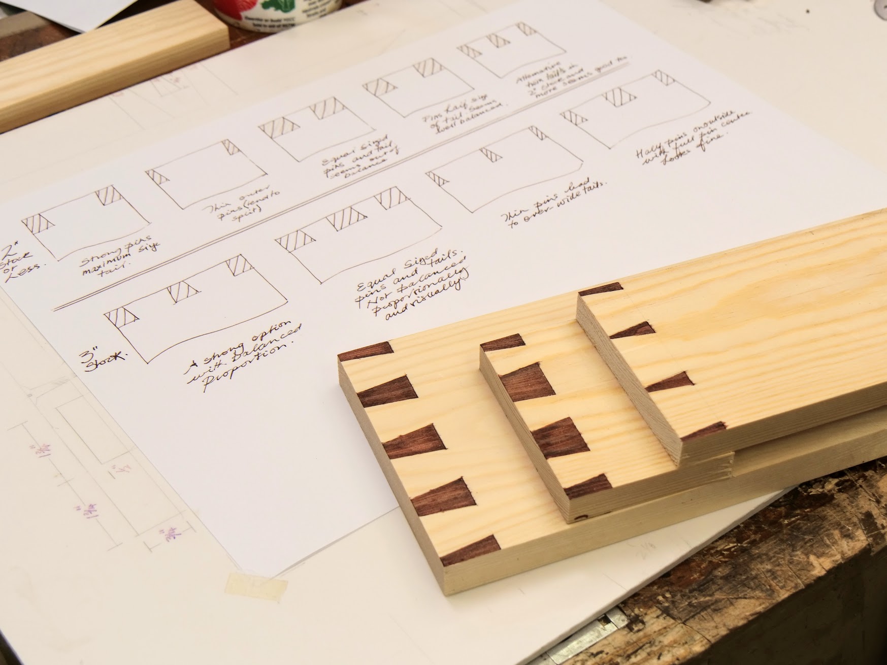 In my work I often lay out my dovetails on a section of wood cut from the stock of my tail pieces. I also might use some card stock or if i am working from drawings i will have either full size drawings are scaled drawings to work from. Doing this, shading in the pins, helps me to visualise the proportions better. If you can decide that you want a certain size for pins you must then decide whether you want full pin sizes or half pins to the outer edges first.