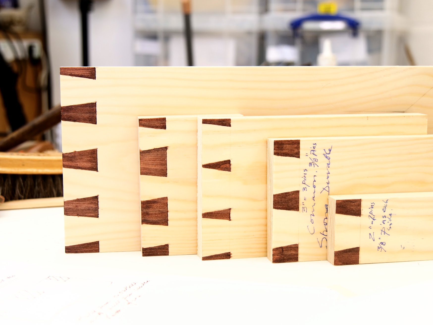 Structurally I have looked for pin strength in dovetails as the dovetailed aspect is always strong because it is always at least as wide and mostly wider than the pins. In my own work I aim for a minimum size of 1/4" and mostly 3/8". Now that doesn't mean I won't go down to less or up too. Just that somewhere around 3/8" has bags if strength without being too large and I like its proportions because, well, it has the appearance of solidity and strength. So let's jump to multiple dovetails as generally speaking there is a predominance of this in our work.