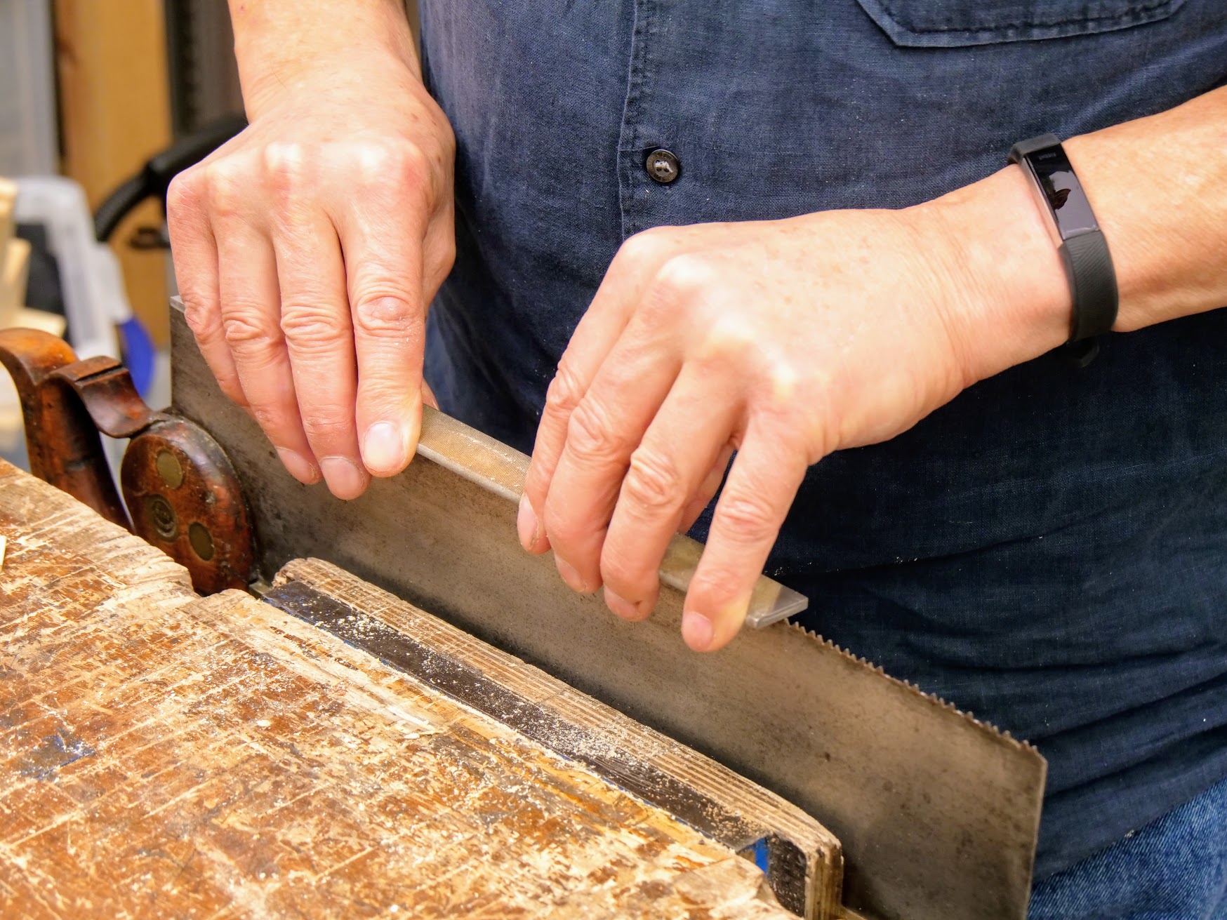 To keep ahead of the game, to work efficiently, I have to keep my body fit and lean. Why? Because my work demands muscle, strength, accuracy. There is a synergy I generally do not withdraw from but for a few days in a year. Though I walk and run each day, these contribute very little to the strengths I need in my actual work. The muscle development for walking and running do not equip me for bracing for saw thrusts, planing and holding my body in position for minutes on end until a cut is completed. Think heart beat and breath, breathing and pulse. Think stamina for endurance. Running and walking for a few miles a day keeps my mind alert in a different way. What keeps me alert and active the most though will always be my work and my will to work. In my view, woodworking with hand tools demands some of the highest levels of self-discipline and engagement and should never be seen as a passive spectator pastime. In my work at the bench, I no longer practise to establish skill at all. By this, I mean sharpening a saw or planing a board achieves for me a guaranteed outcome. I never sharpen a saw badly any more, so the practise of sharpening a saw is no longer something I need to develop. It's a foregone conclusion that the practise of saw sharpening is now the maintenance of skill and though I need to maintain saw sharpening and maintain my skill levels, my muscle tone, dexterity and sensitivity are already irrevocably in place. The only way I might lose them is if I don't do them. They are all in good and excellent shape. They don't improve, so it is not to practise saw sharpening in the way of personal training in any way but simply the practise of saw sharpening.