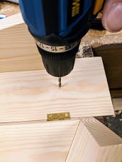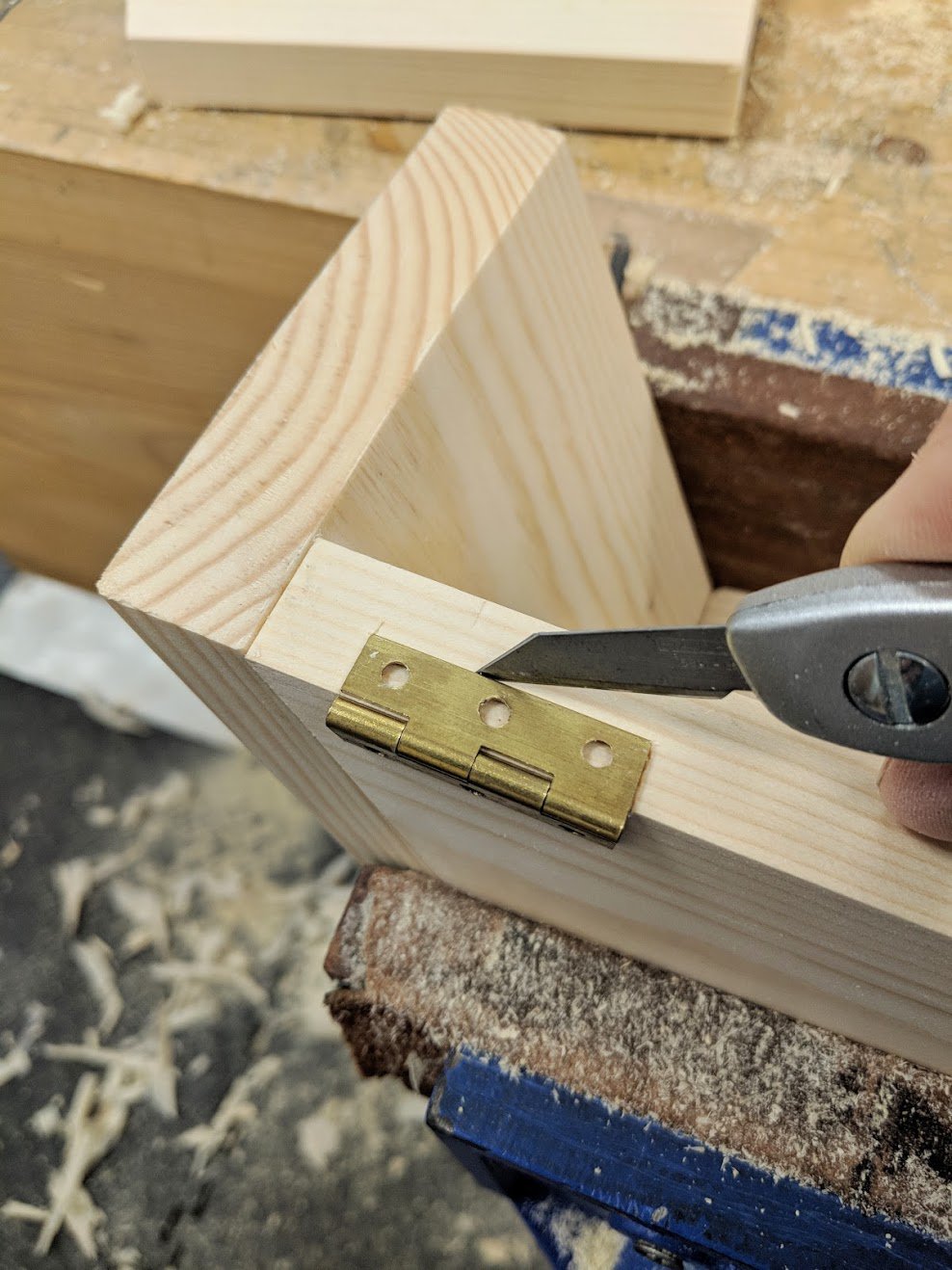 The top hinge is position 1/2" down from top edge of the side piece and the bottom hinge 1 1/2" up from the bottom edge. Place the hinges in position and mark around them with the knife.