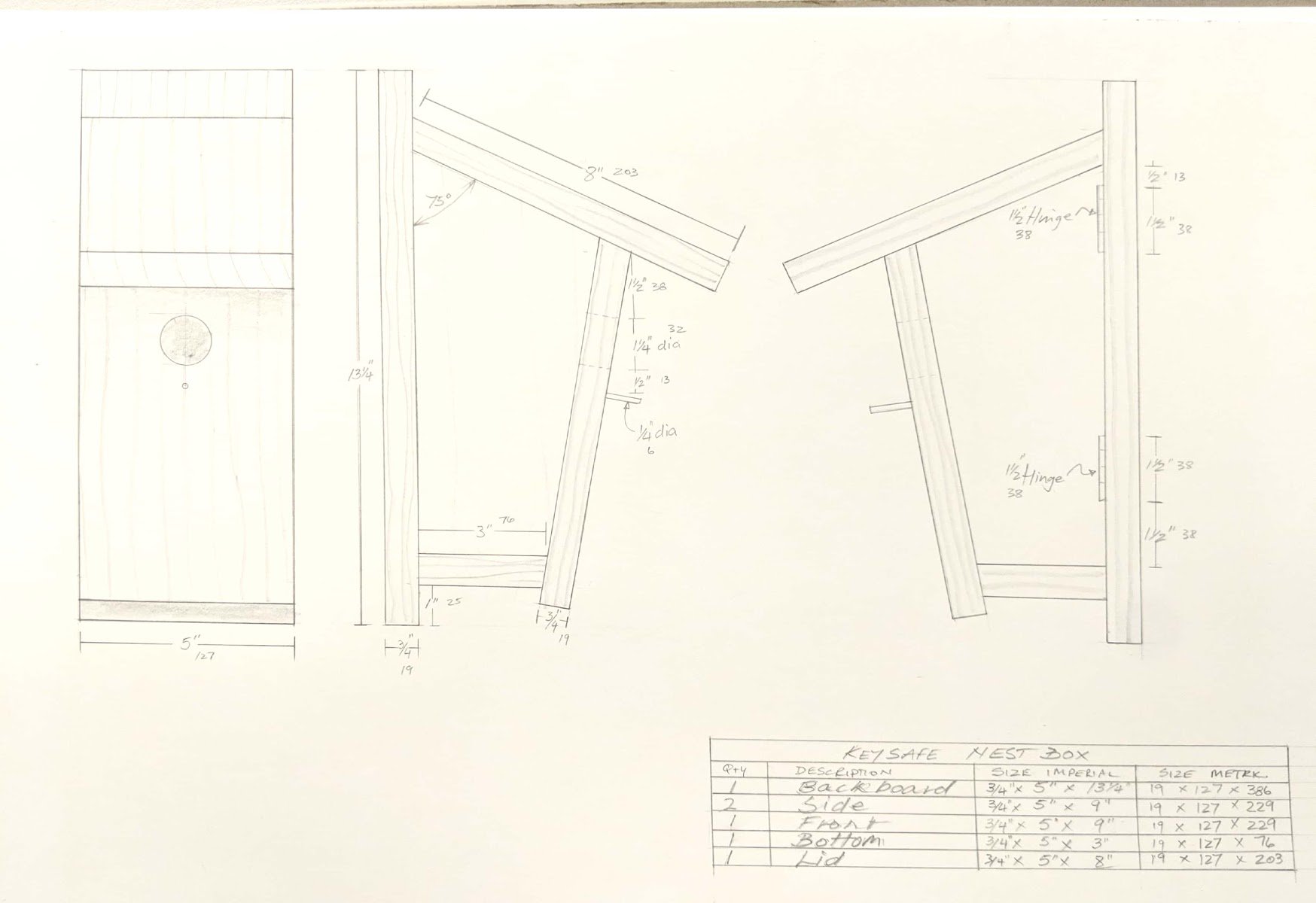 In need of a safe, inconspicuous spot to keep a spare gate key, I made this fake nesting box. It could be a permanent nesting site for cavity nesters too, with a little modification. Though I have never forgotten or lost my keys in all my 68 years, things could one day change. A Masters key safe works well for many situations but can draw attention to its location. The advice that came with the key safe is to conceal it where possible. The nesting box works well because it's distinctive and attractive and weatherproof too. My first thoughts were for a fall-front followed by a lift up lid and that would work but I wanted access that gave my largish hands room to punch the buttons, squeeze the clasp and allow the drop down access door of the key-safe to give me more open access. Flipping to the right answered all issues for a right hander.