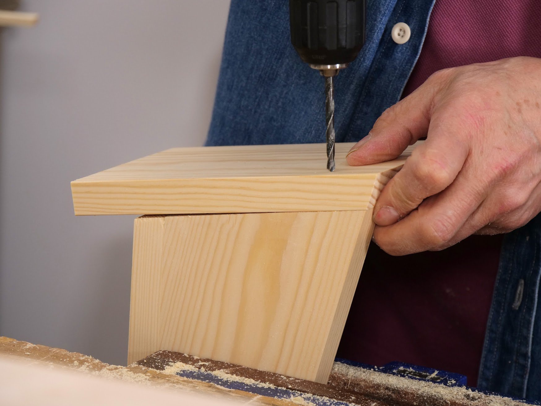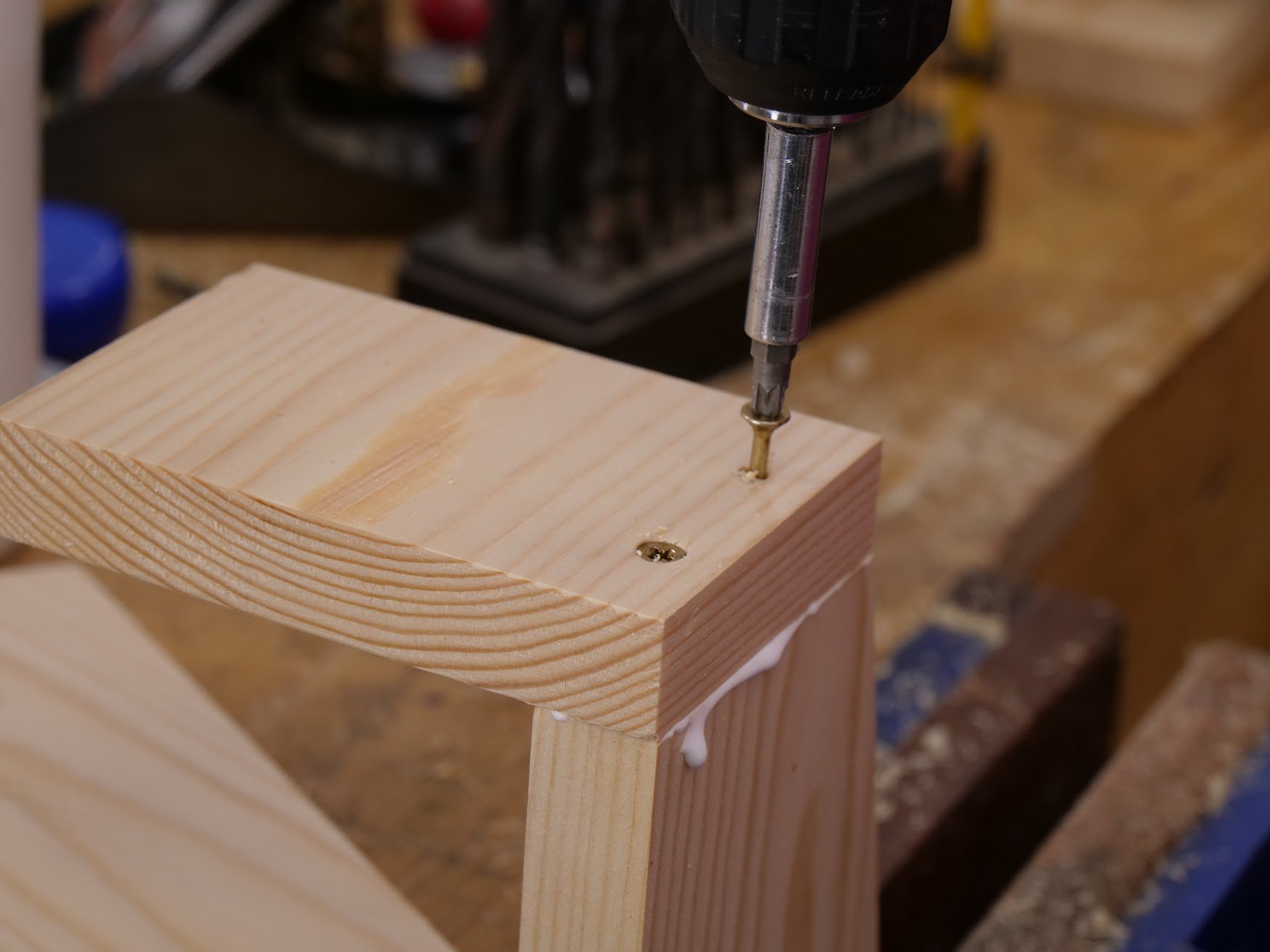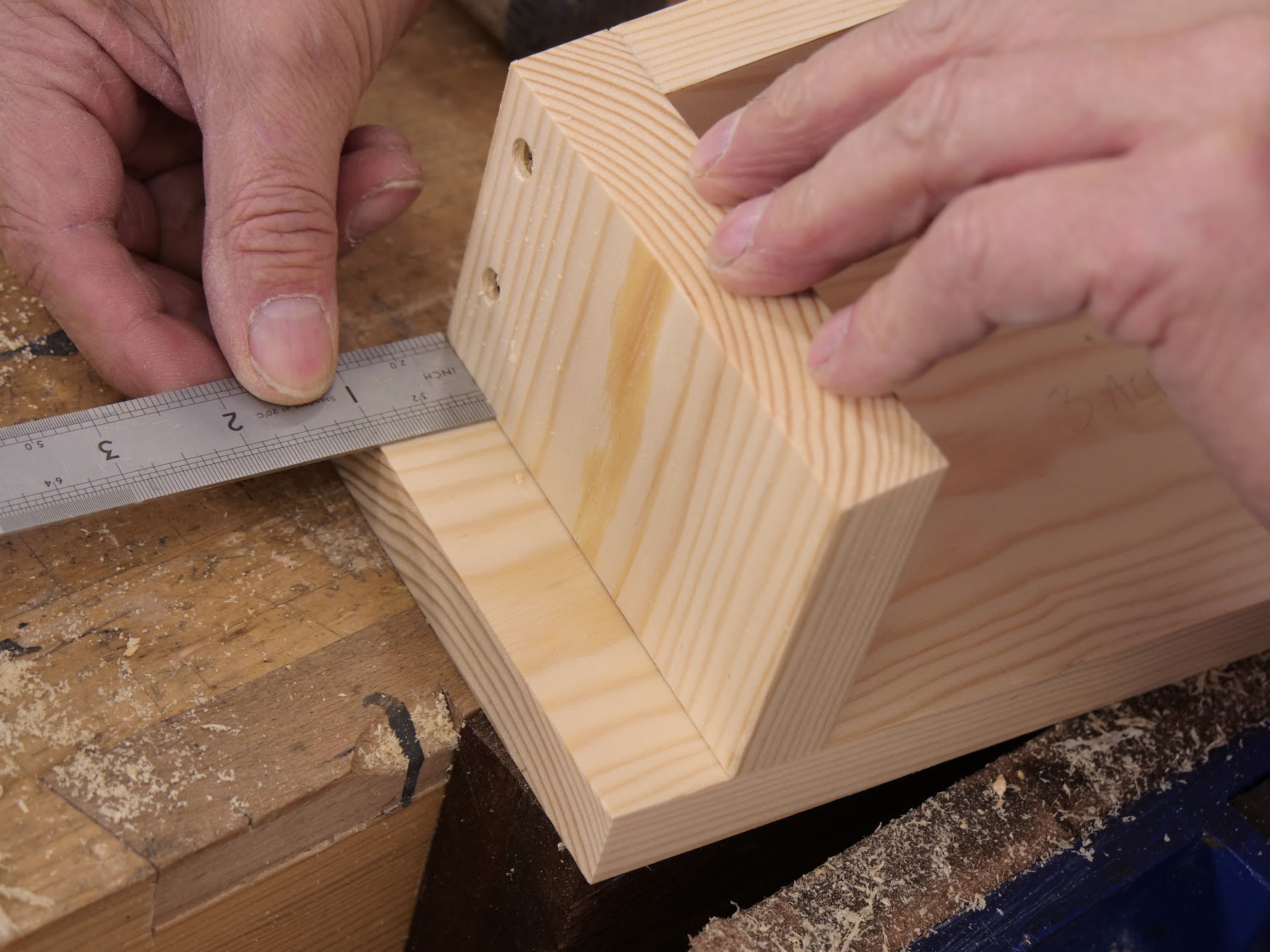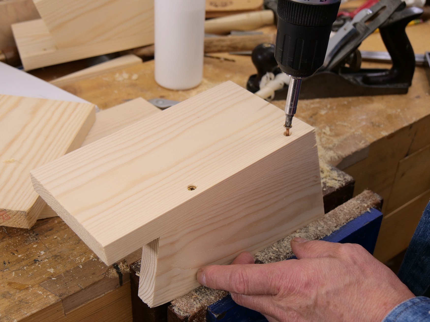 Now attach the front piece to the side piece with two screws. Plane the angle to the front piece top edge to follow the rake of the side piece.