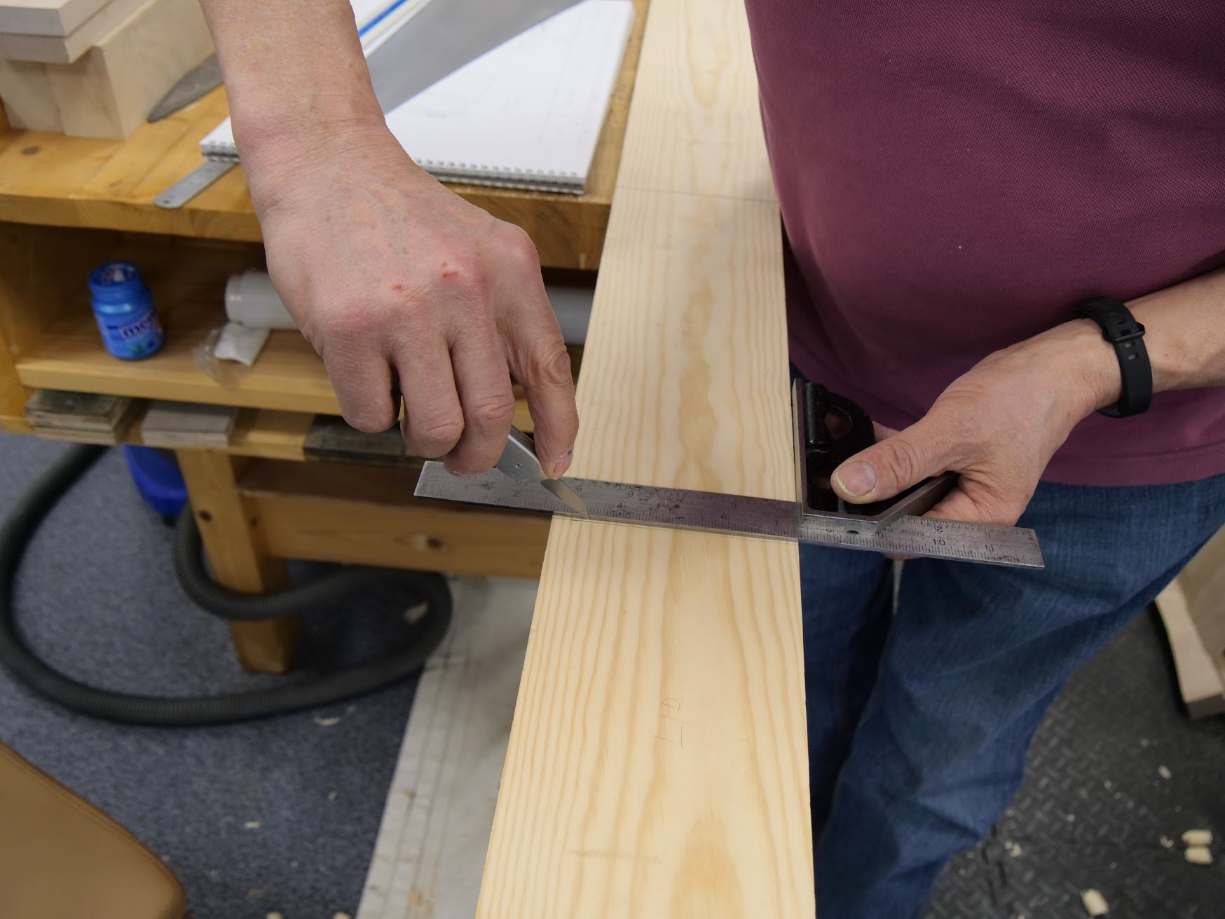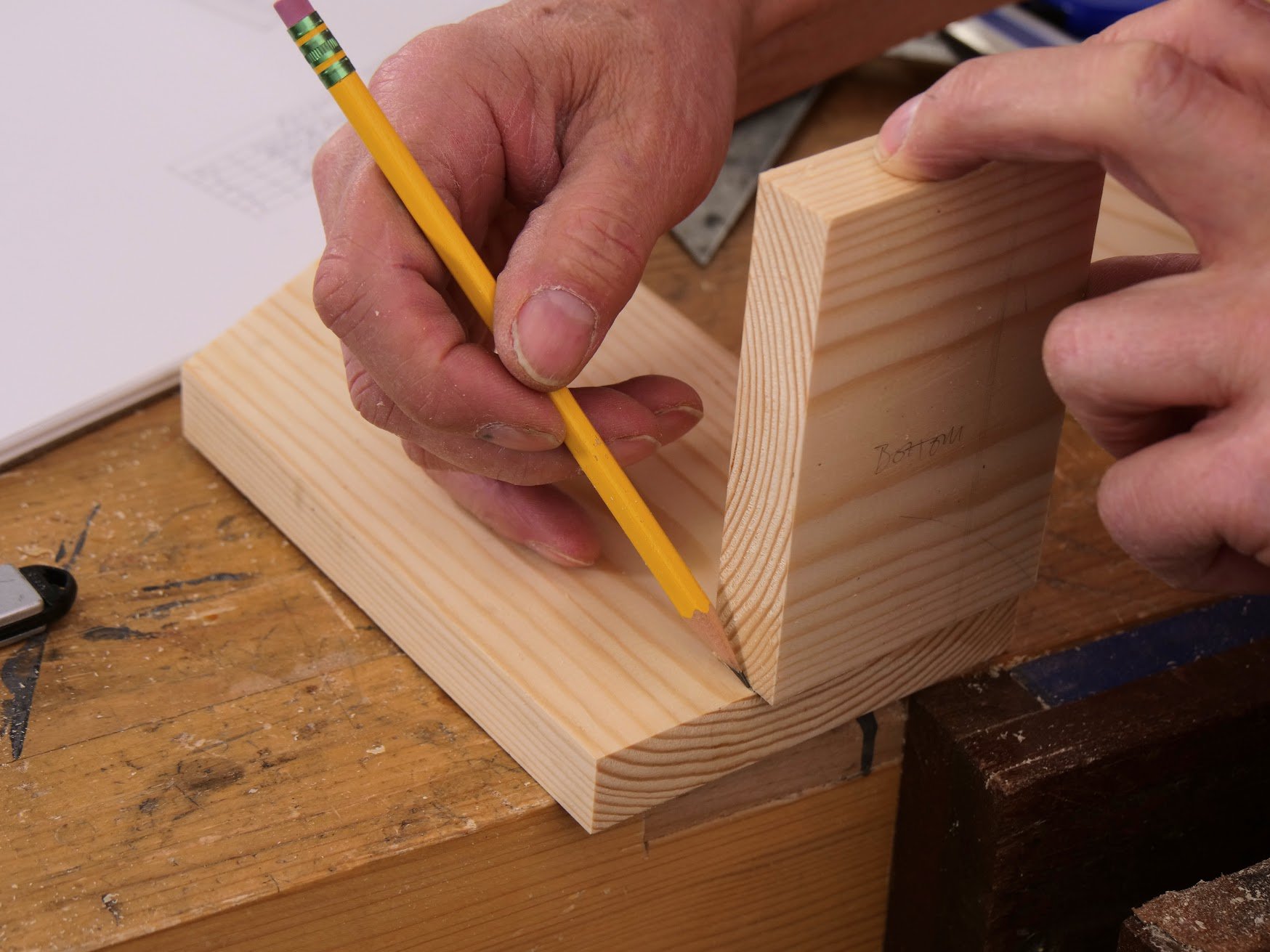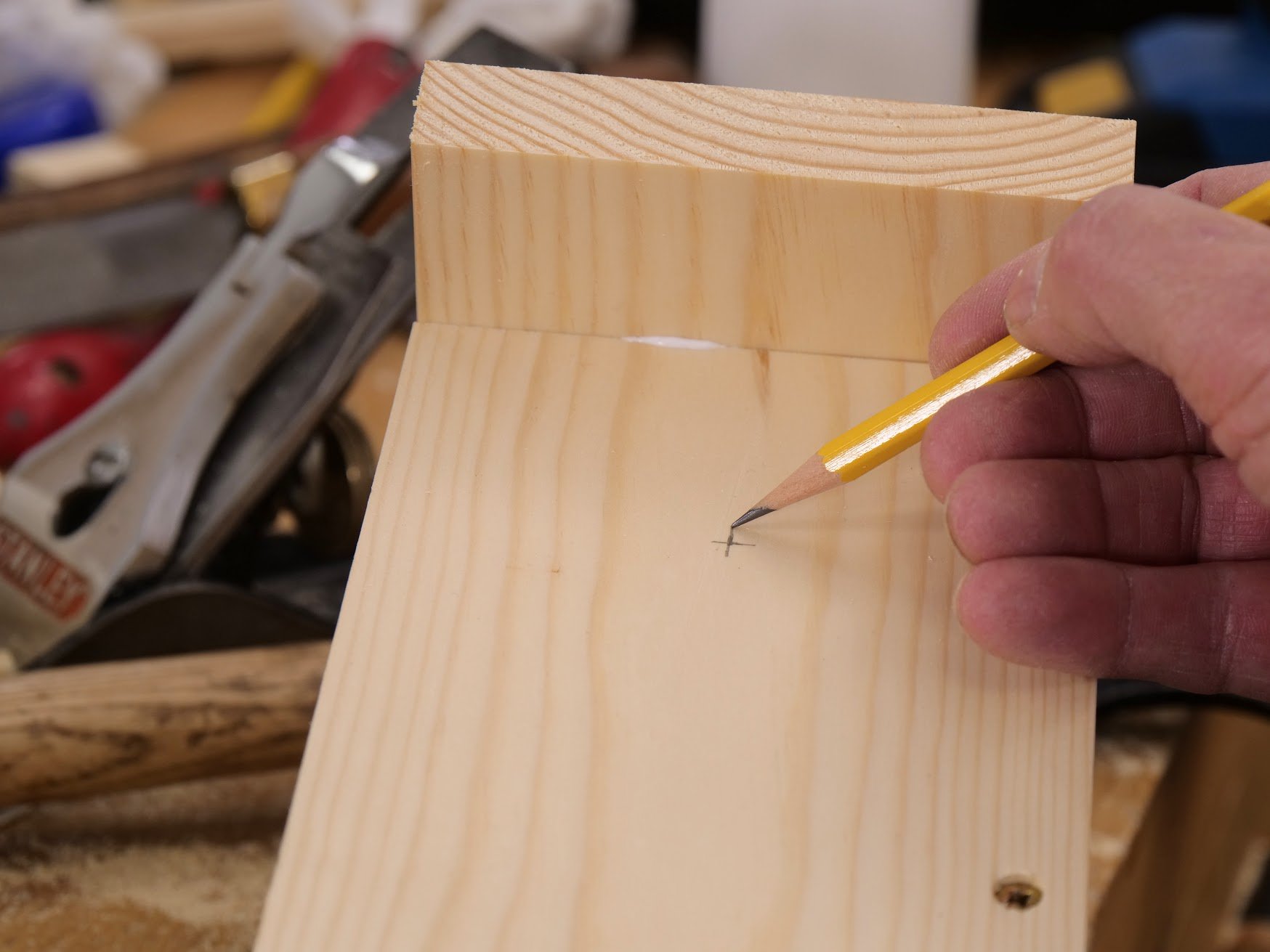 Place the the bottom piece flush with the back edge of the side piece and make a mark.