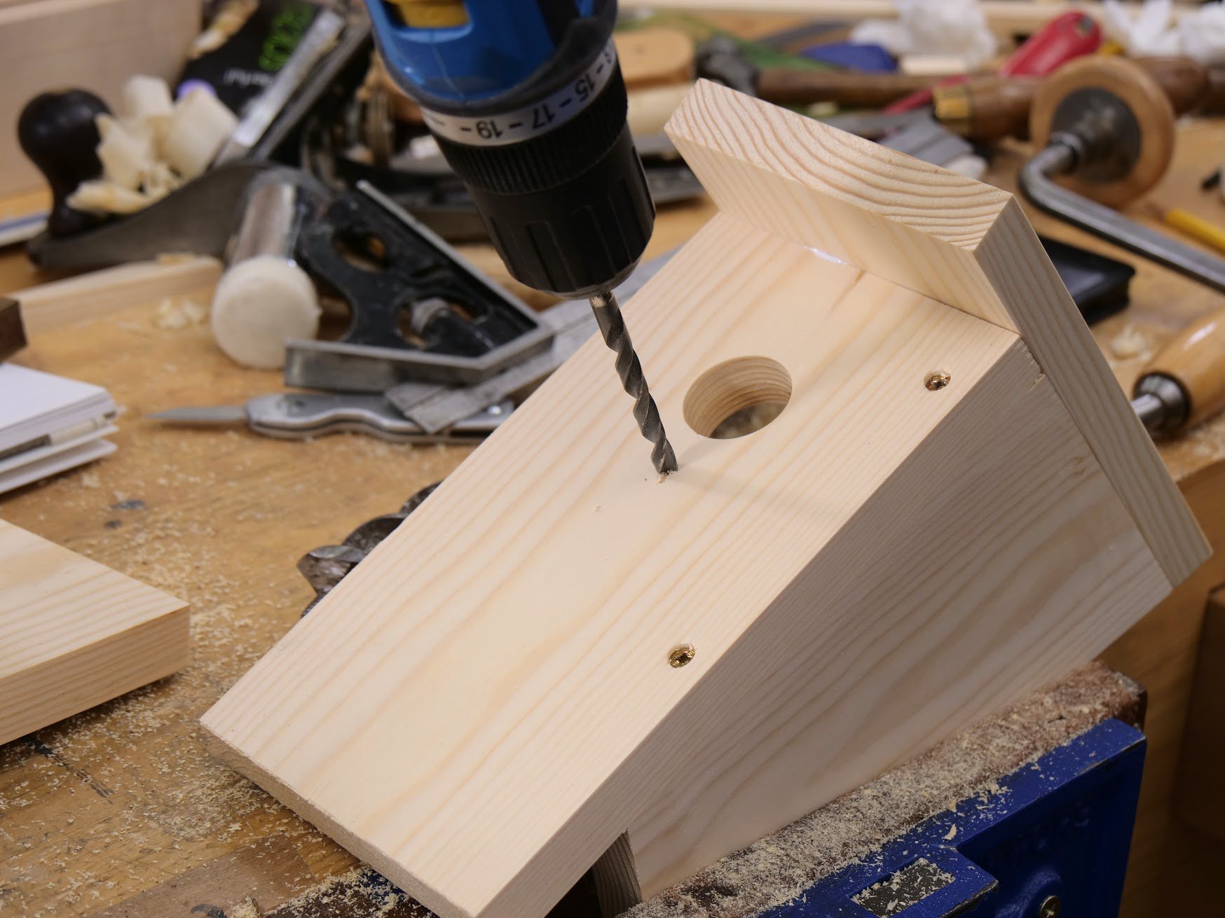 Use a 1 1/4" bit to drill the main entry hole. You can drill only part way if you will not ultimately use the nesting box as a bona fide nest box and blacken the entry hole.