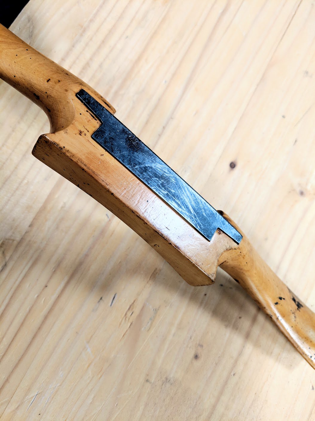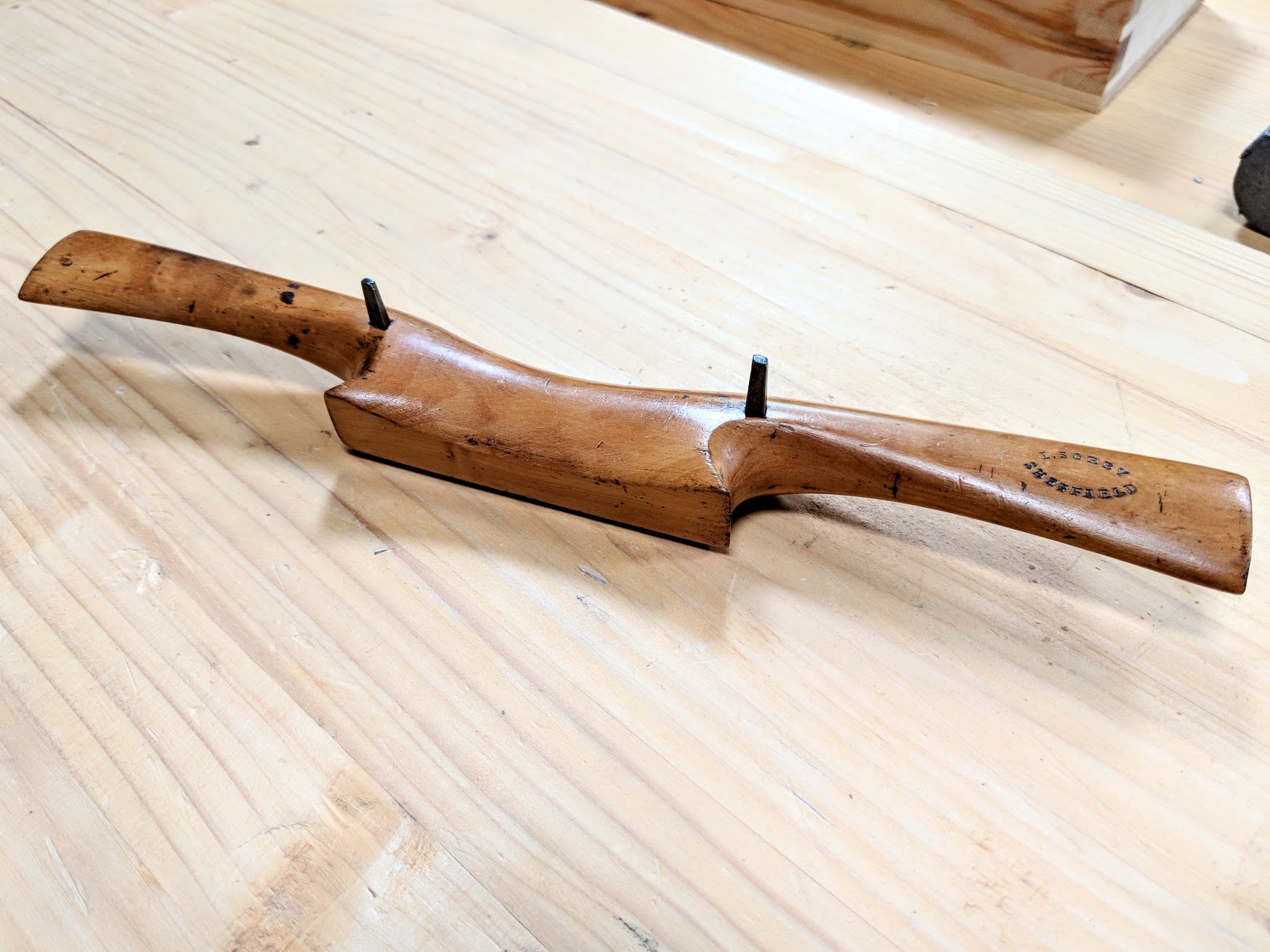 The second tool of the week for me is a boxwood spokeshave also made by I Sorby. I did pay close attention to the photographs but was really surprised at the quality and lack of previous use. I must sharpen this too yet but everything is in premium condition and I am looking forward to using it. Things to look for with this type of spokeshave is discolouration around the points of the protruding tangs and rust on the tangs themselves.Excesses in either can indicate tangs that will not tap away from the body and can indeed split or snap the wood. The other aspect from pictures is that you cannot evaluate whether there is enough hold within the tapered hols for a friction tightness which these spokeshaves rely on for depth adjustment. Mine was just perfect. You should not think that you can just hammer-bend the tangs because they can be too hard and therefore brittle to bend that way.