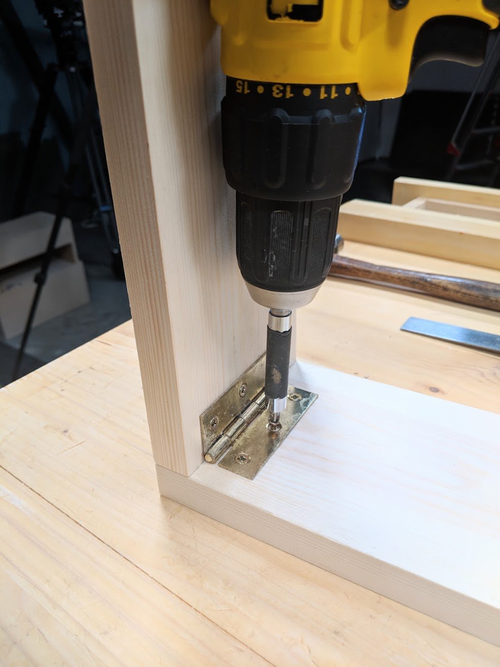 I used a 3" butt hinge in the corner, fixing it first to the ends of the side pieces on the inside faces as shown and then, flushing the side piece with the end of the back board, fixing the hinged end pieces to the back board.