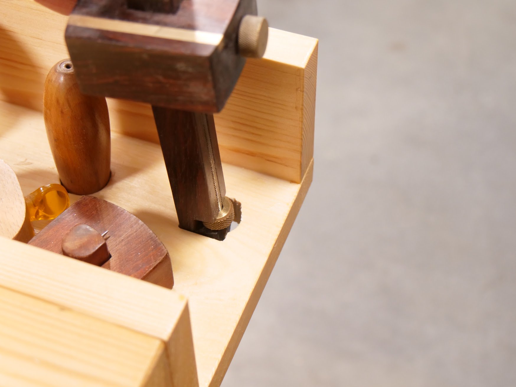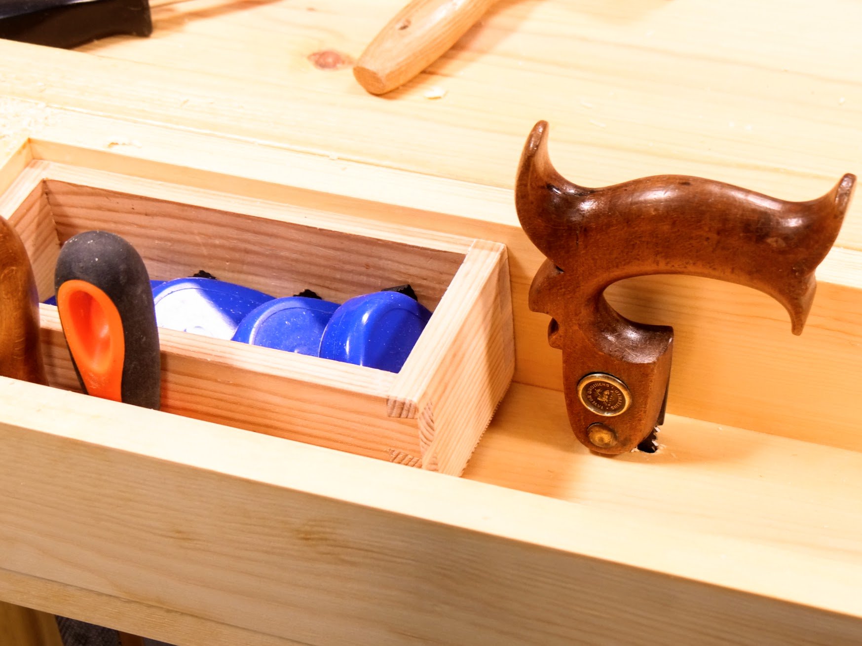 The distance for me is very different. All of my work is governed by the benchtop and the vise itself. There's no triangle as such. The vise is my third hand and the workbench my anchor. they are an extension to my own hands and body. The worktop tends to become more crowded the longer the day goes on. Having a place for each tool helps me to organise them and to then keep organised. As they are constantly pulled to task minute by minute, having their permanent places directly attached or located on the bench itself is just plain practical and easy. In a compact place like a garage or shed, space is at a premium. Organising not only the tools but the way they hang is very helpful. My joinery saws, planes, layout tools and chisels are barely two feet apart. Dead simple and easy. Because I sharpen up many times a day, my sharpening plates and strops go where they have been for decades. After the video we made on some of the bench upgrade I went back in to refine my work; micro-adjusting the little details. Rasps and files found their home, as did flathead screwdrivers and chisel trays, scrapers, my combination square and my tape measure box. I have my lesser used chisels there in front of me but having the chisel tray means I can pull the size out that I want or I can pull out the whole tray and place it in the well. Other tools are immediately behind me, still only a spin on the heel to reach them out.