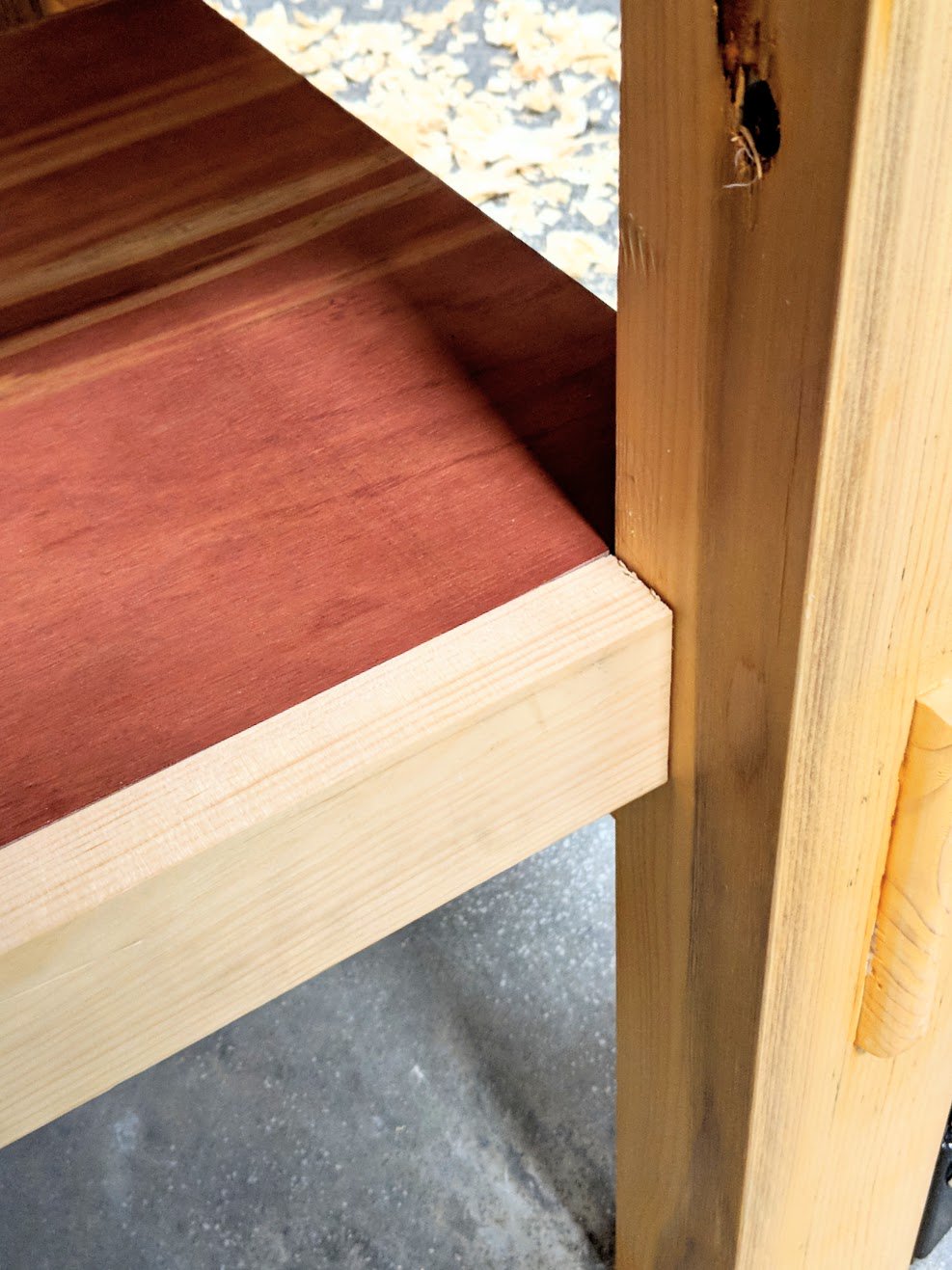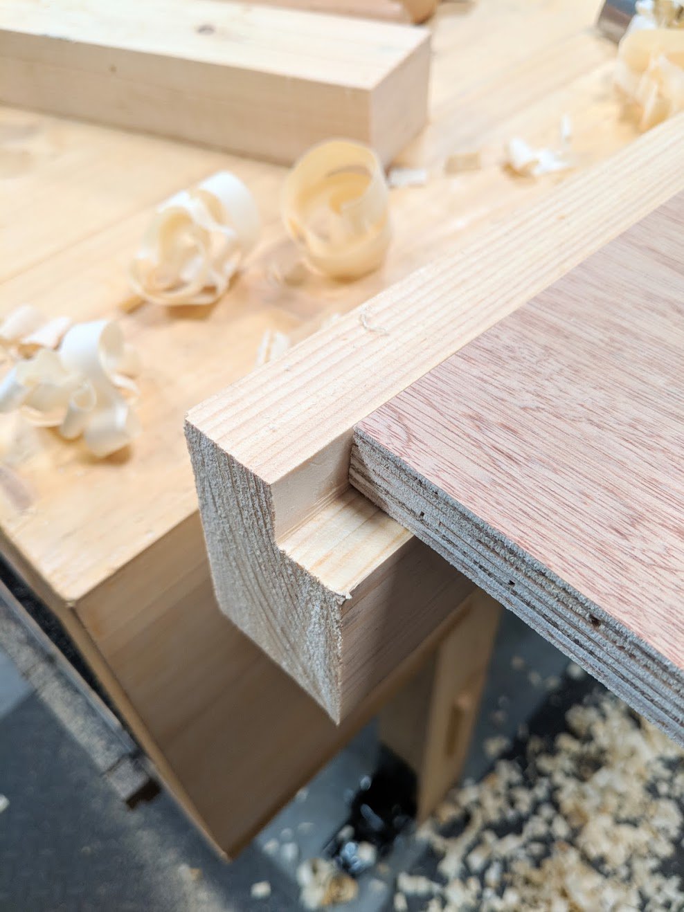 I rebated the lengths with a #78 Stanley to form a 3/4" (19mm) by 3/4" (19mm) rebate. This forms the step down for the plywood and gives it good and sufficient support.