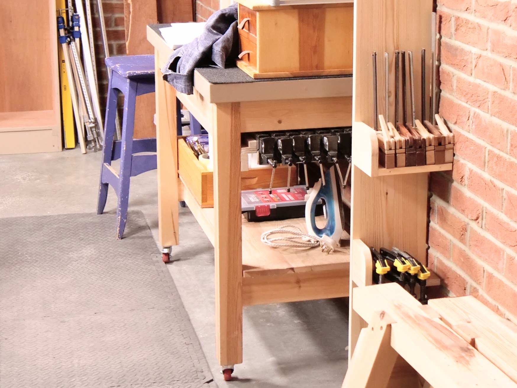 The moving work surface behind me was something I made for the woodworking school a few years back. To stack project wood on mostly. I made two of them and they became ever more useful to me even outside of class time. I find them handy for what they give me because they can be swung in at anytime to support my work and working. The one behind me is already installed and working great for what I need. I can take it completely out or move it along left or right if I need saw horses setting up to rip sheets or boards if I need to. I have room for the second one either side at the end of my workbench and I am thinking of doing just that and installing the vise and the grinder on there. That frees up the underside of my workbench for the shelf and I can use that then for stowing wood from a project, tools, equipment or whatever.