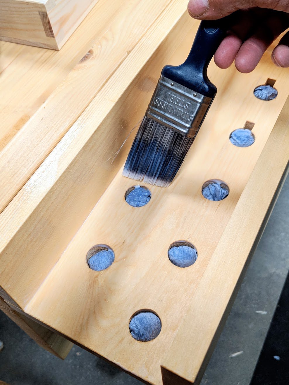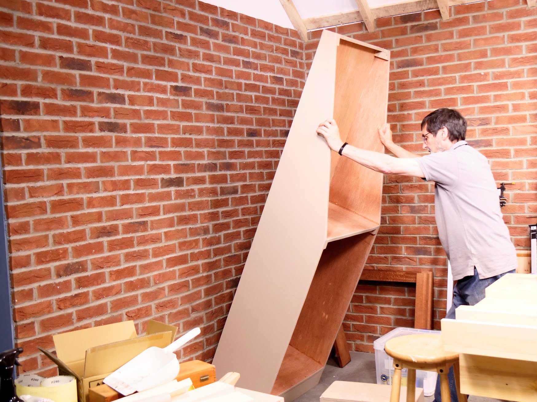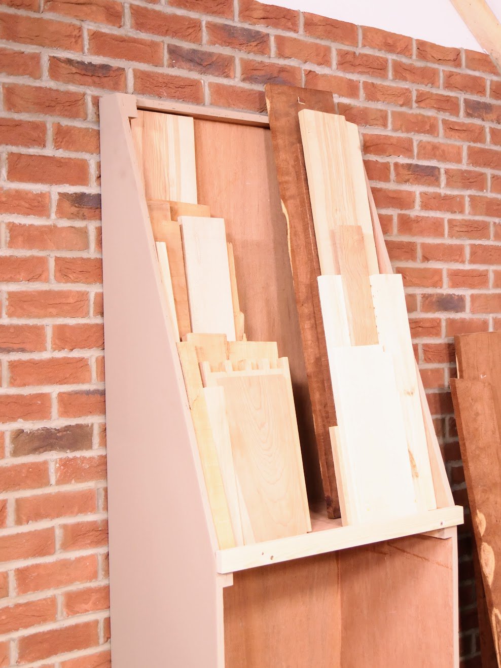 I cut down one of my old plywood storage cupboards from the castle to make one part of my planned triple-unit wood storage. It would have been quicker from scratch with fresh plywood sheets but I couldn't stand the waste. This one is to tier for shorter stock and offcuts and will stand at the end of my garage.