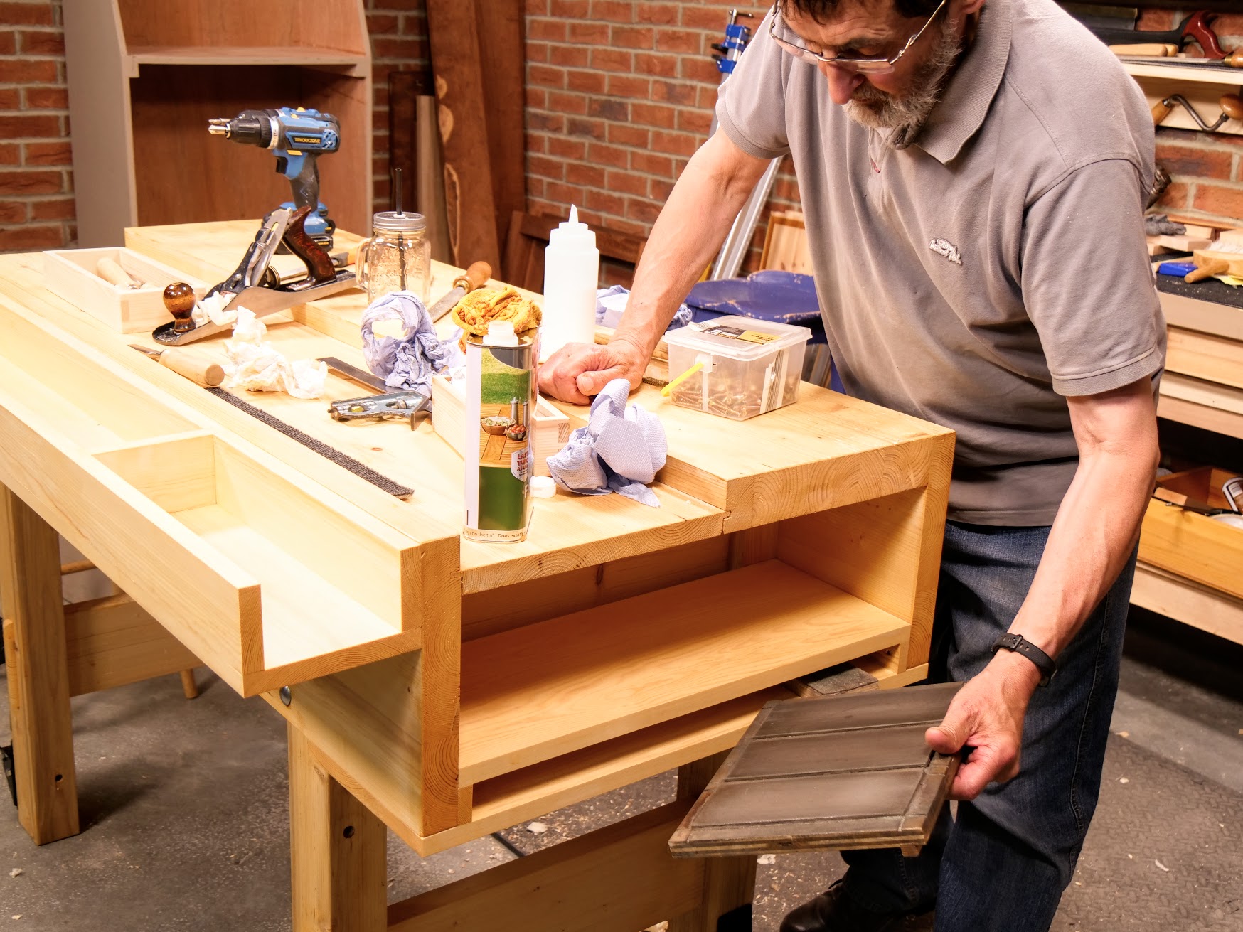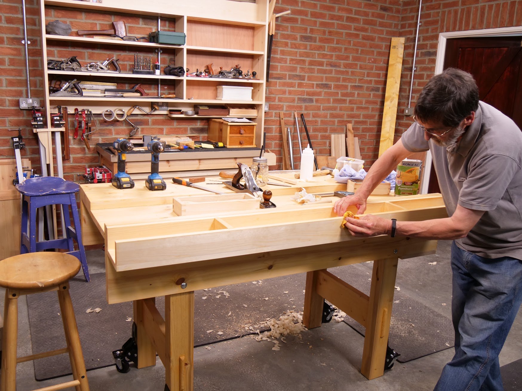 Adding the upgrades to my workbench makes me feel more settled in; like I'm here to stay! When you get used to something being the way you intended and then it's disrupted for a period you realise a bit how you spoiled yourself. But it's even more than that really. After two years at my last workshop I had it to where I felt it worked. It wasn't the big things so much as the small ones that made it work. This is especially true if you use only hand tools. Up until two and half years ago I had a bandsaw in my workshop even though most of the time I still used hand tools. In addition to putting in the main shelves behind me, I added my sharpening plate and strop shelf which is a non negotiable for me because I have never found anywhere more convenient yet more out of the way. I also added the same cam lift casters I used on my last workbench because in a limited space like a garage it's necessary sometimes to reorient the workbench to optimise a technique, assemble a larger project for gluing up or facilitate any other particular work need. One of my workshops in the USA was 8 meters (25feet) by 12 meters (40 feet) and another one, shared with friends, was 12 meters by 25 meters (80 feet) but in the US it's not unusual to own a garage 8 meters by 8 meters, whereas in Europe that is rarely the case anywhere.