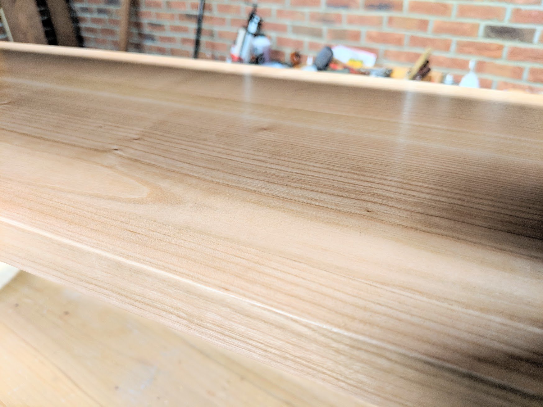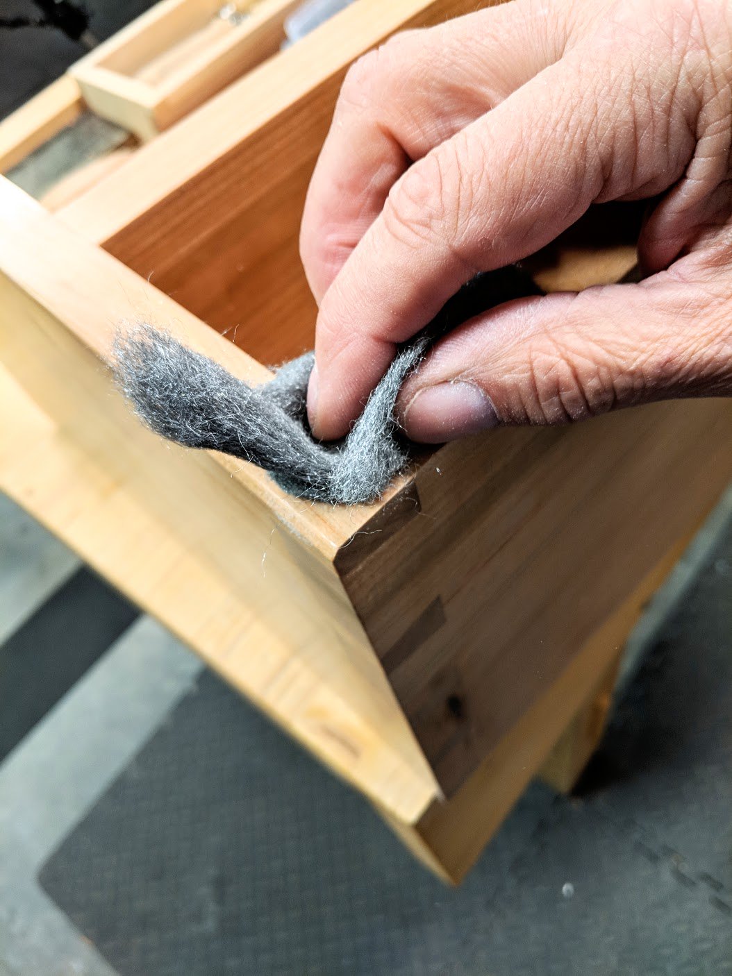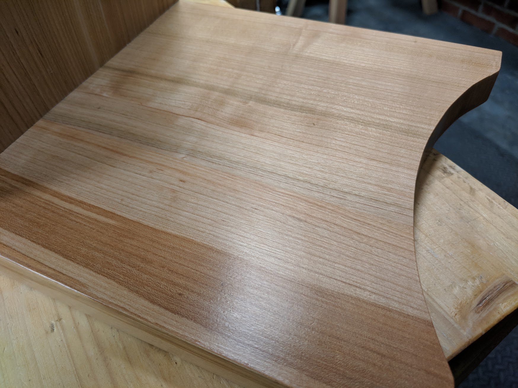 Over the years I have chosen different wood finishes for different reasons and different protective qualities, strengths such as durability and such. Few products replace varnish for outdoor use for instance, but oil-based polyurethane works well for indoor work like furniture, and exposed cabinet work used in millwork, doors, stairways and such. In recent years we've been given an alternative product, a water-borne poly or some other such thing under different names but essentially made for the same purpose, the same reasons from the same or similar enough constituents to be one and the same. In this week's use of finish I chose a water-borne floor finish. I applied 4 base coats followed by three top coats with sanding after the first and third coats to 250 grit. I then applied a fourth coat which remained unsanded but was steel wooled with fine 0000 steel wool before the application of a soft wax furniture polish applied again with 0000 steel wool and buffed out with a soft cloth.