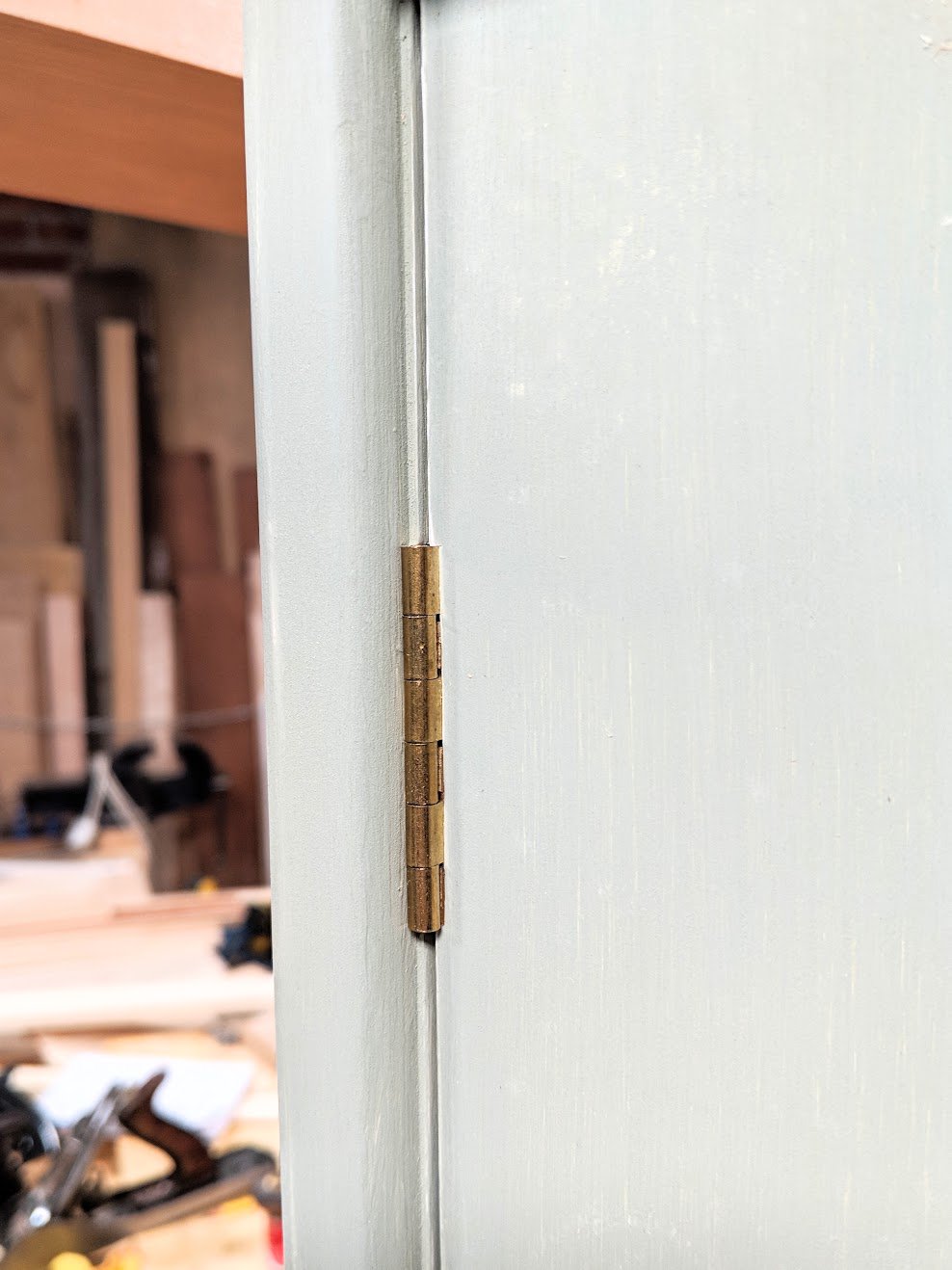 Anyway, my unconventional way of using the hand router to lay out cut lines for mortise hole and tenon cheeks resulted in perfect pairing for all 8 joints in both of the projects. That's zero fitting of the tenons to the holes or the holes to the tenons after my system was used. The joints slipped together for a permanent lifelong marriage as I intended. It's now a proven system paralleling and matching the proven technologies of M&Ts developed in centuries past that have never actually been succeeded by anything truly better. Of course that is only my view. To make the M&T joints I used a square, knife, 2 chisels, 10" gent's saw, hand router, chisel hammer. Lifetime tools. Mostly tools most woodworkers might have already bought when they first launched into woodworking but were beguiled by the machine and the sales personal selling them. I don't know if I could have made my joints much faster using machines. Not that `i wanted to at all. Each joint took me roughly ten minutes for each one. Untwisted, well-made doors emerged from the pile of shavings on my workbench and the the floor below. I felt happy through every single stroke of work even when I was slightly off on one shoulder line, which I fixed with five successive strokes of the plane.