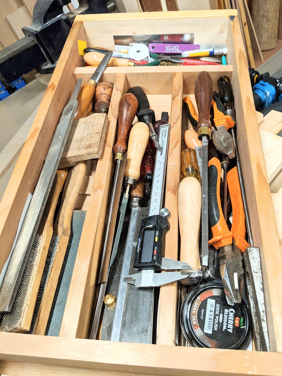 We recently filmed the making of the workbench drawer as a follow up to the workbench build for YouTube (not out yet). It doesn't take too long to make a drawer but filming makes the wholly simple process much more complicated and it takes longer because of a variety of things. The thing is that I lived without this drawer for a few weeks in the new garage workshop and the negative result of not having the drawer made me ever more aware of just how handicapped I am when it is not there.