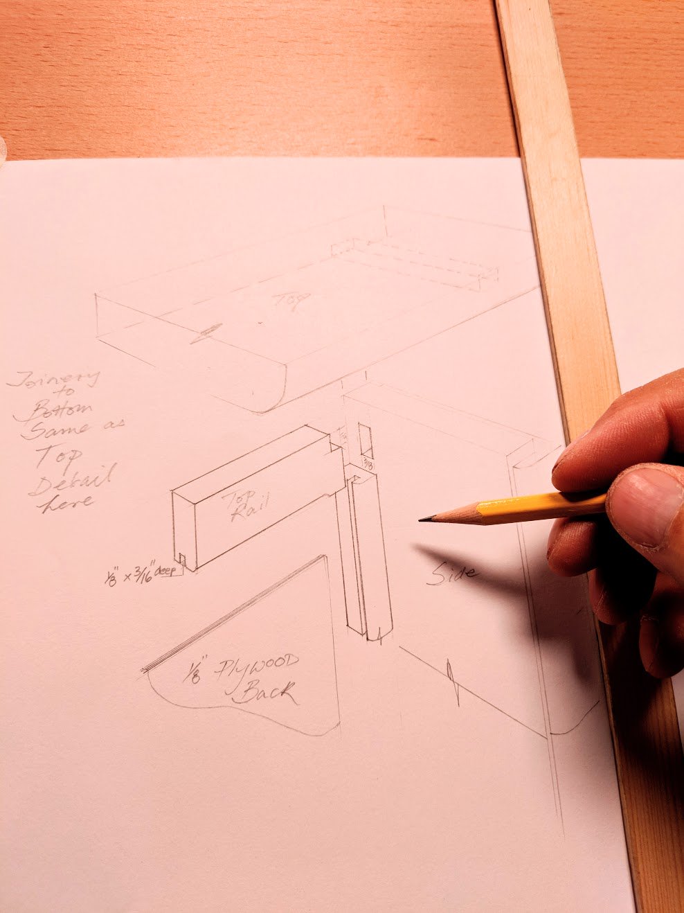 Working on our own we might convince ourselves that there is only us and therefore no need for a drawing. In my view it is always worth a drawing of some kind or another. Seeing then that drawing makes me think about issues I might otherwise overlook in the building of a project. I will at some point usually regret not drawing a project up ahead because I simply didn't think through certain proportions that later led to me scrapping what I planned in my head but did not plan out and flesh out on paper, cardboard, a piece of wood or the back of a napkin. Also, once completed, joints are often hidden inside themselves, whether wholly or partially and can be completely lost to the outside world. When that happens, and I have failed to draw out the details, I have to retrace my steps one by one and use logic to regain what would have been simple with the addition of a drawing.