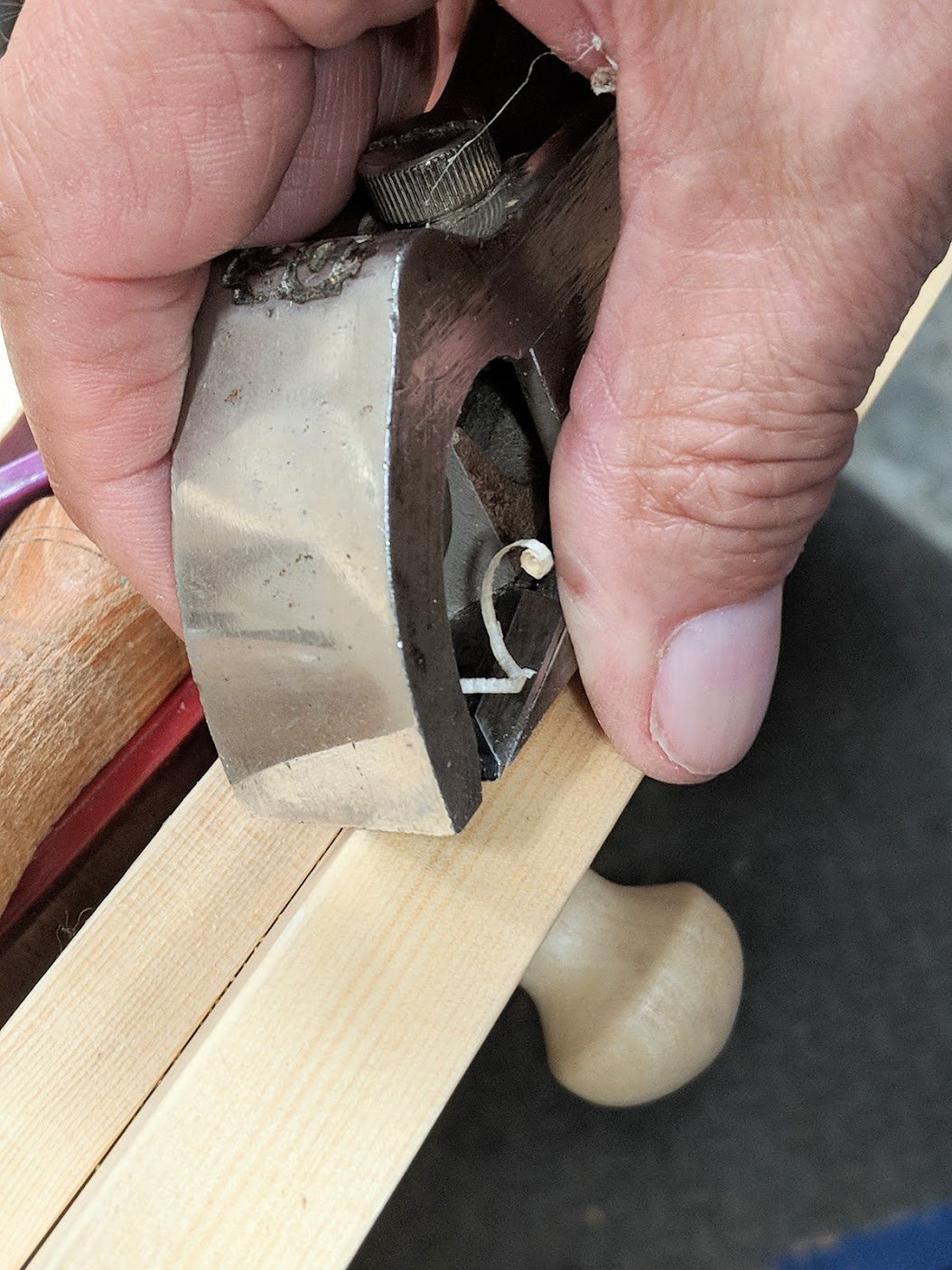Straddle the plane like this, trace your thumb and fingers to the wood either side, and you can take off a good, clean and deep arris.