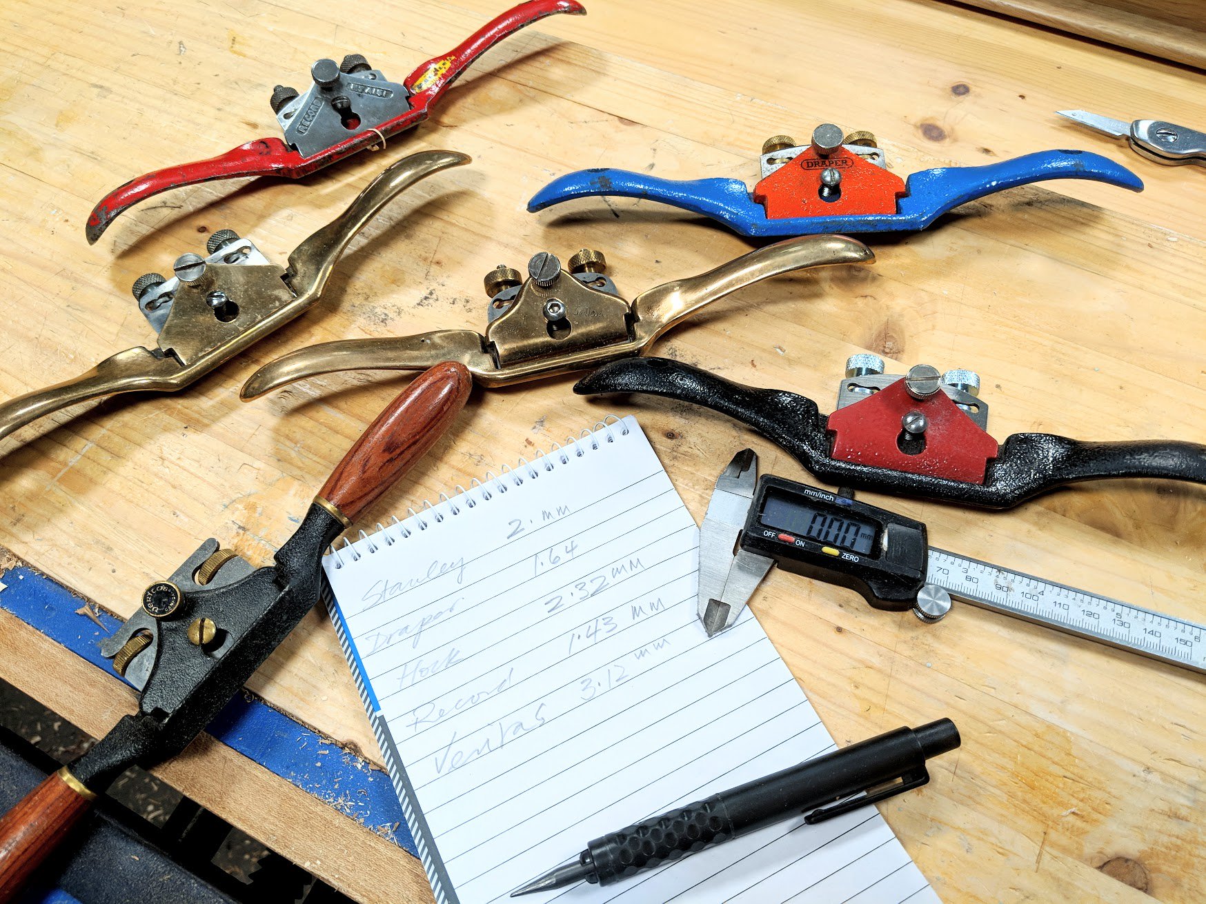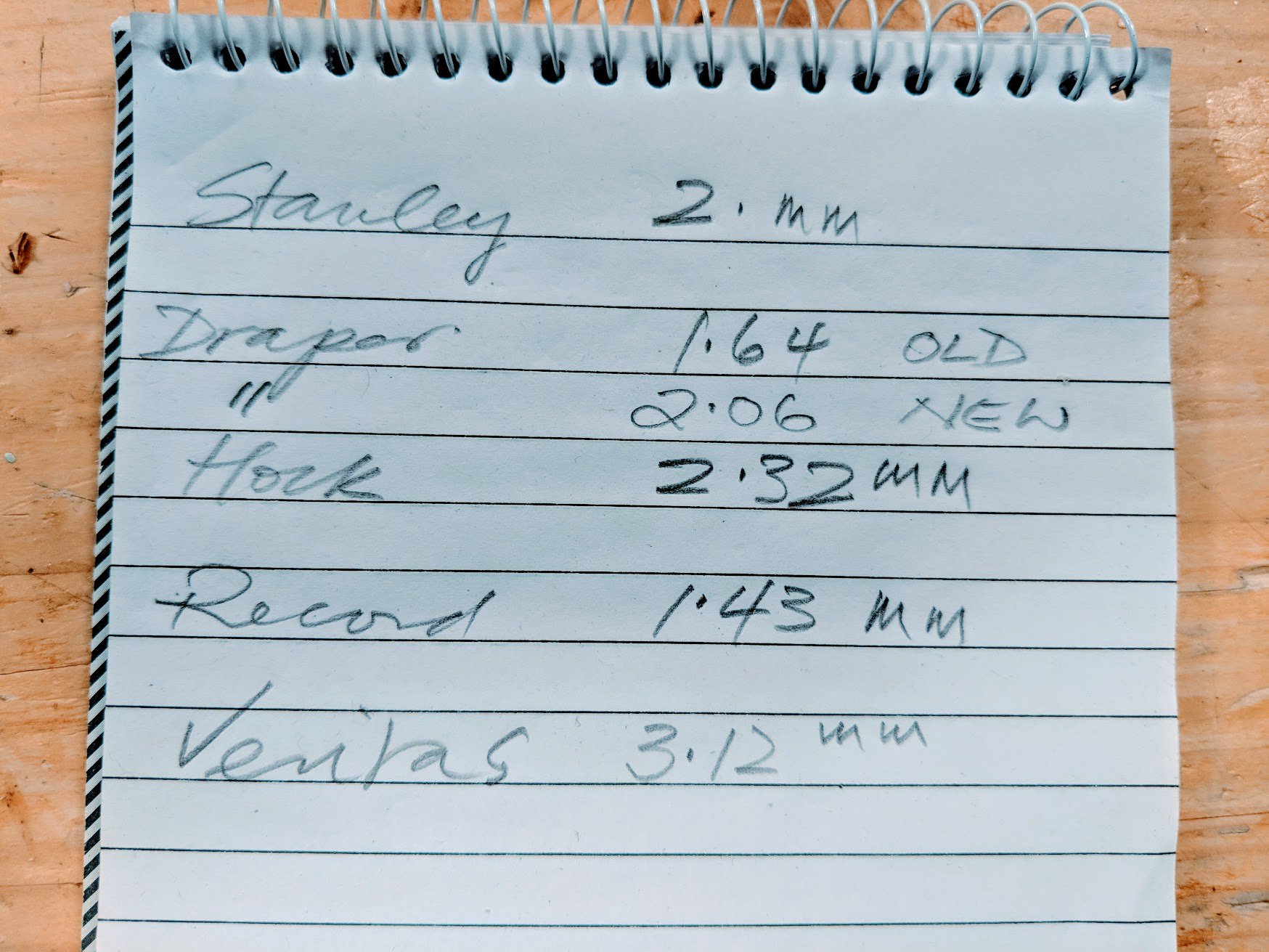 What I did was measure the thickness of the irons and noted them down. I was surprised at the differences in thickness. Because these spokeshaves are all bevel down types the thickness makes no difference in terms of effort because the angle of presentation is not altered by the slope of the bevel as is the case with bevel up spokeshaves.