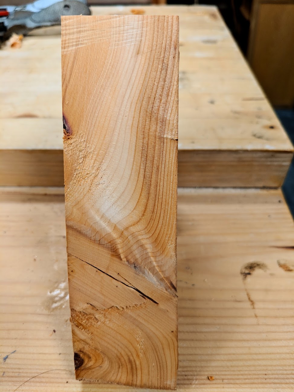 In making my plane handle for the main rear tote, which takes a lot of shaping, I found that the yew was very inviting. With its dense grain it shapes well with carving tools, rasps, spokeshaves, saws like coping saws and planes. It scrapes if some tool fails to and sands beautifully too, so for plane handles it is more than an ideal wood.
