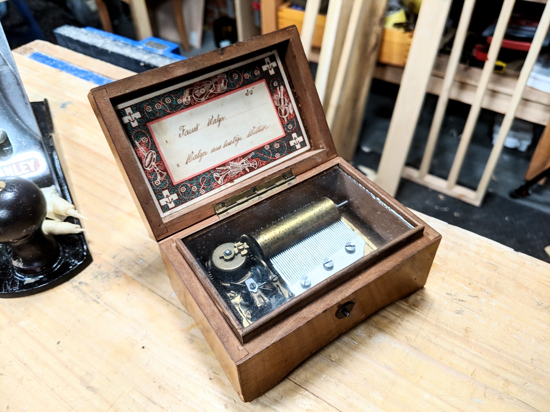 The music box is an old one. I have had it since 1987 but it dates back far beyond that. The glass does not quite fit and the outside need refinishing with shellac. When that's done it will be a fully functional model. It's only a few minutes work to preserve what was put together by another.