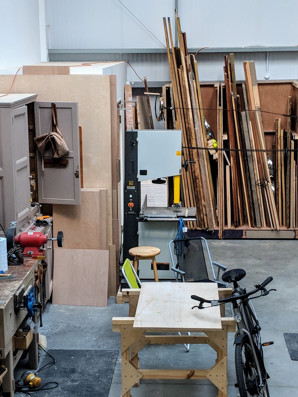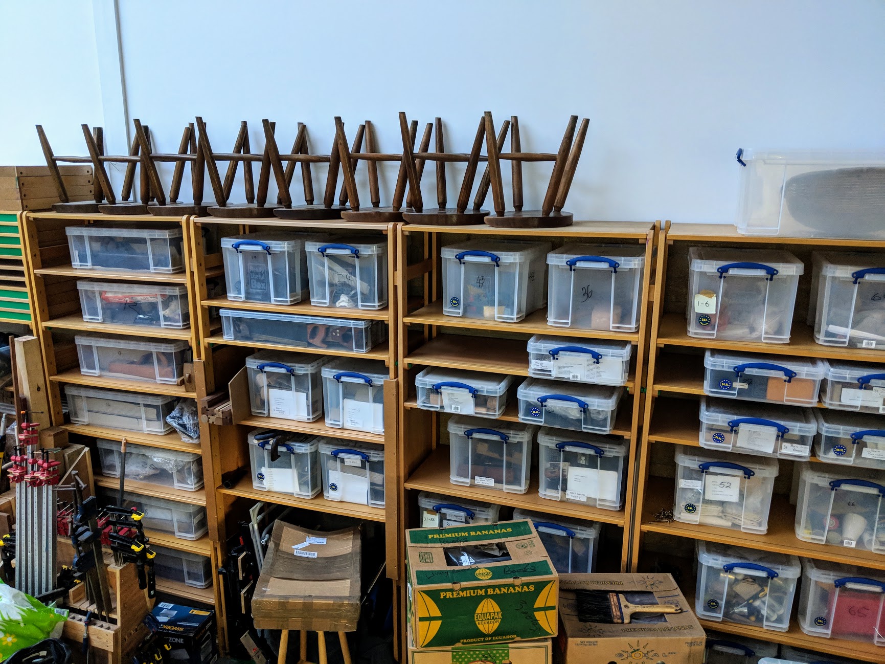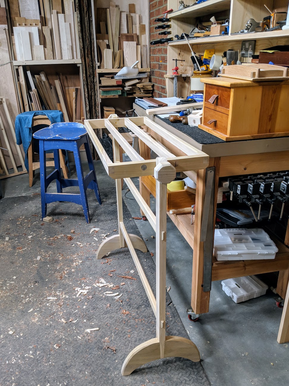 This week seems to have opened with a full promise of good work ahead. With the final episode of the clothes airer completed as a far as intros and outros done I did my usual full sweep, vac and put up. We have also been organising our storage area beyond the office and the garage and Joseph and I have managed to get everything on shelving at long last. This is additional work area we reserve for trialling, in-house teaching and training and such and now it feels quite complete and safe. The boxes are filled with the tools we have trialled and restored through the years and then too of course the school tools for teaching my courses. This area is good for about six people to work at individual benches. Hannah has her space there and is currently working on a small table in cherry and maple. Izzy practices there too and tests out tools as she makes joints and gets prepped for writing on Common Woodworking, which by the way has been very well received. Phill's bench and tools are out there too and then we have a couple of spares. My old bench is there and that's where I take care of the other stuff that goes with owning a big building. Here is the more likely place that I end up cutting out the back of a cabinet made of pressed fibre board or build a plinth for an office fridge. It works.