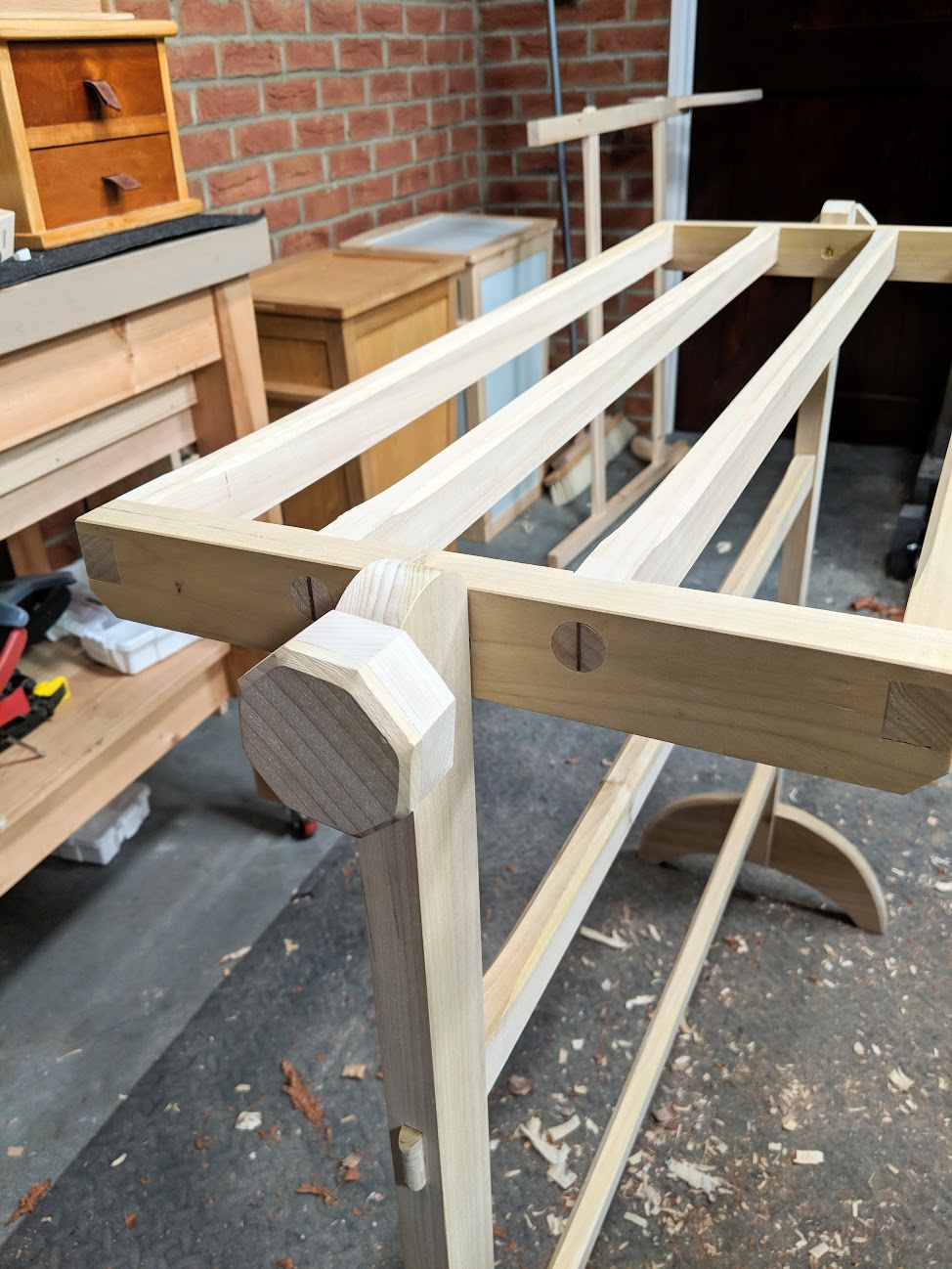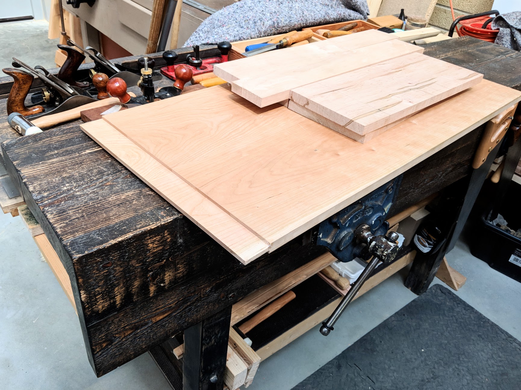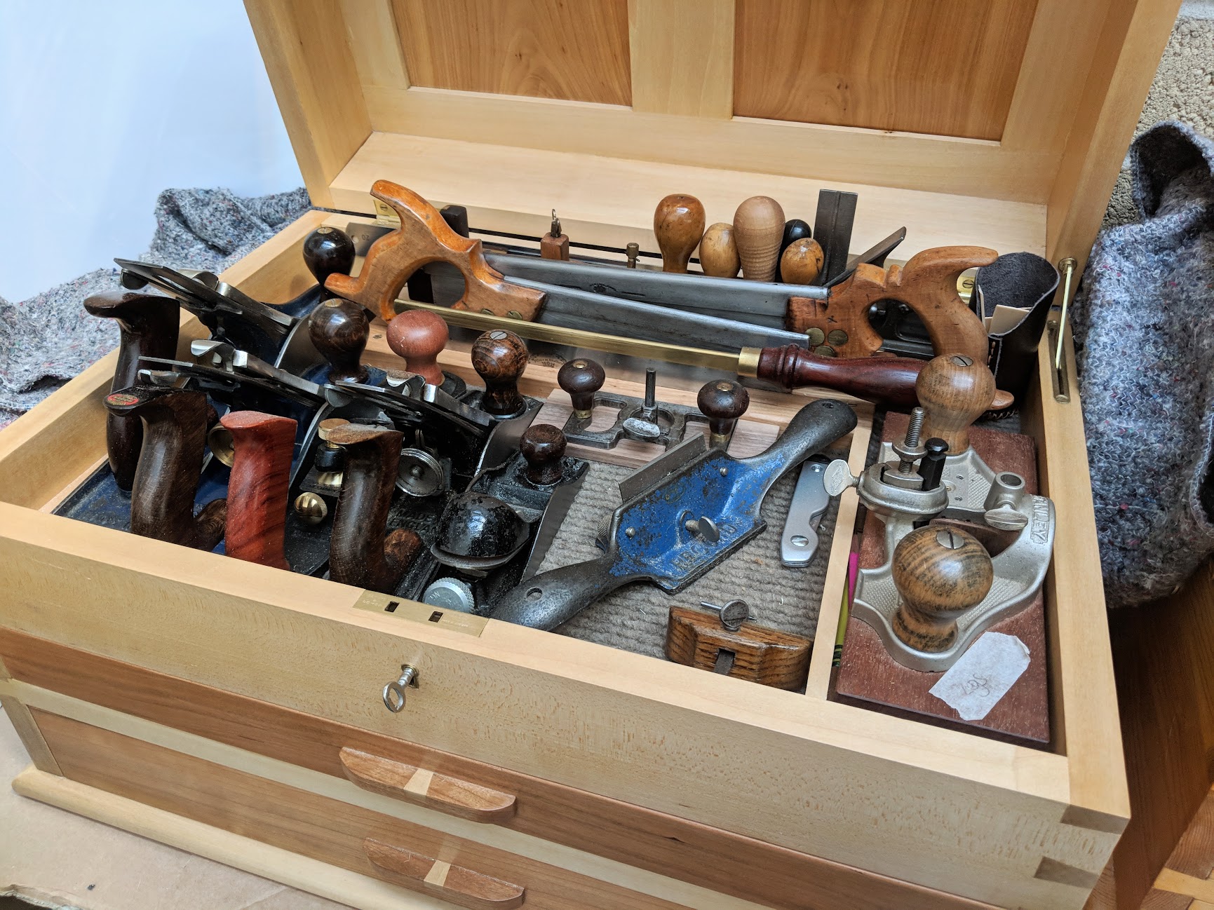 This week seems to have opened with a full promise of good work ahead. With the final episode of the clothes airer completed as a far as intros and outros done I did my usual full sweep, vac and put up. We have also been organising our storage area beyond the office and the garage and Joseph and I have managed to get everything on shelving at long last. This is additional work area we reserve for trialling, in-house teaching and training and such and now it feels quite complete and safe. The boxes are filled with the tools we have trialled and restored through the years and then too of course the school tools for teaching my courses. This area is good for about six people to work at individual benches. Hannah has her space there and is currently working on a small table in cherry and maple. Izzy practices there too and tests out tools as she makes joints and gets prepped for writing on Common Woodworking, which by the way has been very well received. Phill's bench and tools are out there too and then we have a couple of spares. My old bench is there and that's where I take care of the other stuff that goes with owning a big building. Here is the more likely place that I end up cutting out the back of a cabinet made of pressed fibre board or build a plinth for an office fridge. It works.