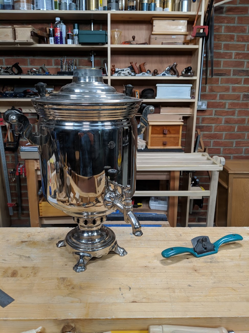 And then of course my friends from Russian who teach woodworking in the Russian Federation came to close up my week and we did have fun. They brought me a Russian version of the Stanley 51 that unfortunately is no longer made. I gave them two large Record vises to take back with them and also some spokeshaves for the children to use that we no longer needed. Not sure if the plane would take off with the two vises! The also gave me an enormous Russian Samovar for heating water with wood to make tea so I can now make my tea and/or even coffee using my ever present wood scraps.