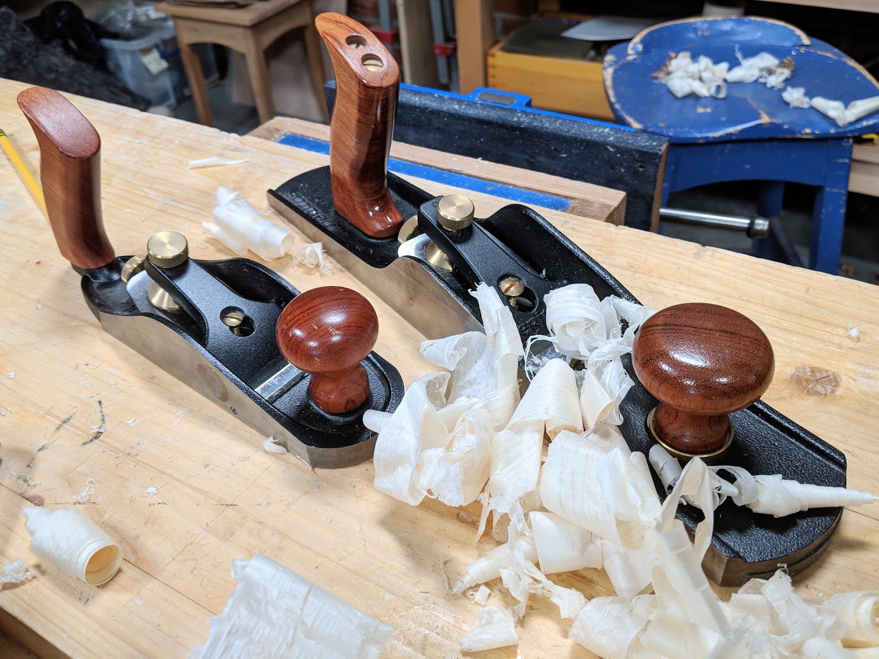 I own a few bevel-up planes. Some, one especially, dates back to the early 1800s. I like them well enough, quite. I think these two are worthy of honourable mention because they are so well made and I have tested them out over a number of years too. The small one is the small bevel-up plane. I keep it close to hand for a certain type of unpredictable work. Small work mostly. That unheavy work I come across from time to time that I might use say a #3 for but not a block plane. These are both made by Veritas under the titles bevel-up jack and bevel-up small plane. Something like that.