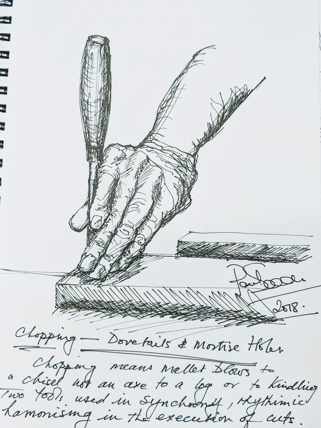 It's true. I allowed myself ten minutes per sketch and then it was pen down. Sketching is my way of looking without spectating. I want to see the twists, flexes and locks that take place to the hand and whereas you can see that with a photo, often photos are staged and they quite often don't reflect the truth of working so much as the imagined. Read the influence of watching or being watched in an experiment that watching has. There are lines in the hand when it is performing a task that expresses information to the observer but especially is this so when nothing is frozen as in a photograph but by the brains ability to register images as memory. Drawing them means that we draw (no pun intended or maybe it is) both with the instrument and the right parts of the brain using both in union as we draw. Because of this we may compare a sketch to a photograph but the brain image is more as a video or, perhaps nearer still, a flipper book. We lock onto the distortions of the hand to make a clearer representation in our drawings.